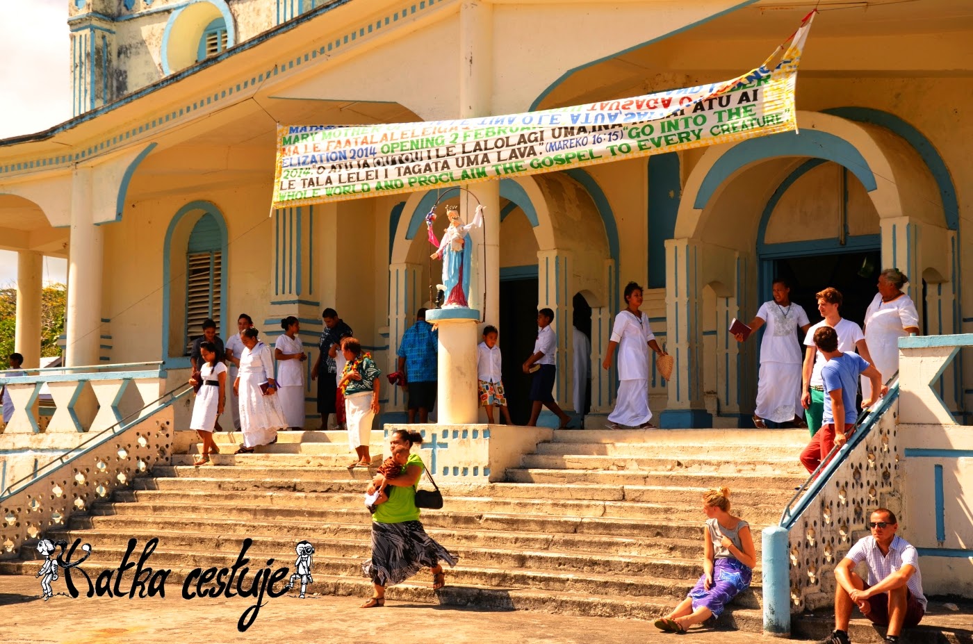 Už při parkování auta (které je u kostela asi jen jedno z pěti) nevěřícně sledujeme okolní davy pobožných Samoanů proudících do kostela a nemůžeme je poznat. Opravdu jsou to ti stejní lidé, které celý týden potkáváme ušmudlané v barevných šátcích a v roztrhaných tričkách? Všechny slečny se dnes proměnily v nádherné nastrojené nevěsty a pánové do pasu uvázali nejluxusnější šátky lava lava a sváteční košile. Je to opravdu jedna velká módní přehlídka. Tomuhle říkám sváteční oděv! Bílá působí v kombinaci s tímto snědým a exoticky divokým národem naprosto panensky a čistě a modely, kterými se během chvilky zaplňuje celý kostel, svátěční atmosféru dokonale podtrhují. Dámy totiž nemají jen tak ledajaké letní šaty, ale složité korzetové šaty s vyšívanými a krajkovanými kabátky, jejichž cenu si uvědomuji ve stejnou chvíli, kdy se snažím vzpomenout jestli jsem tu nějaký obchod s takovýmito šarty viděla – neviděla, takže všechno musí být ruční práce. Nádhera! Jediné, co svátečnosti trochu ubírá, jsou barevné žabky obuté mezi palcem a ukazováčkem, ale bez těch by to už ani nebyla Samoa.