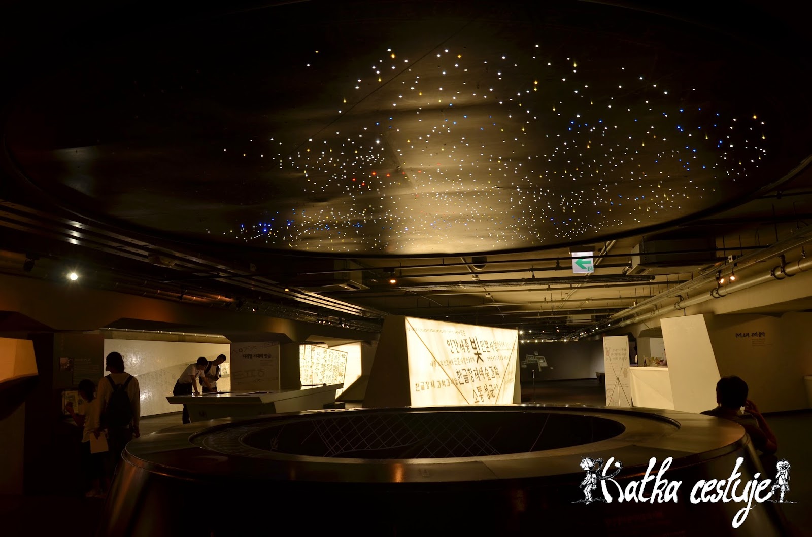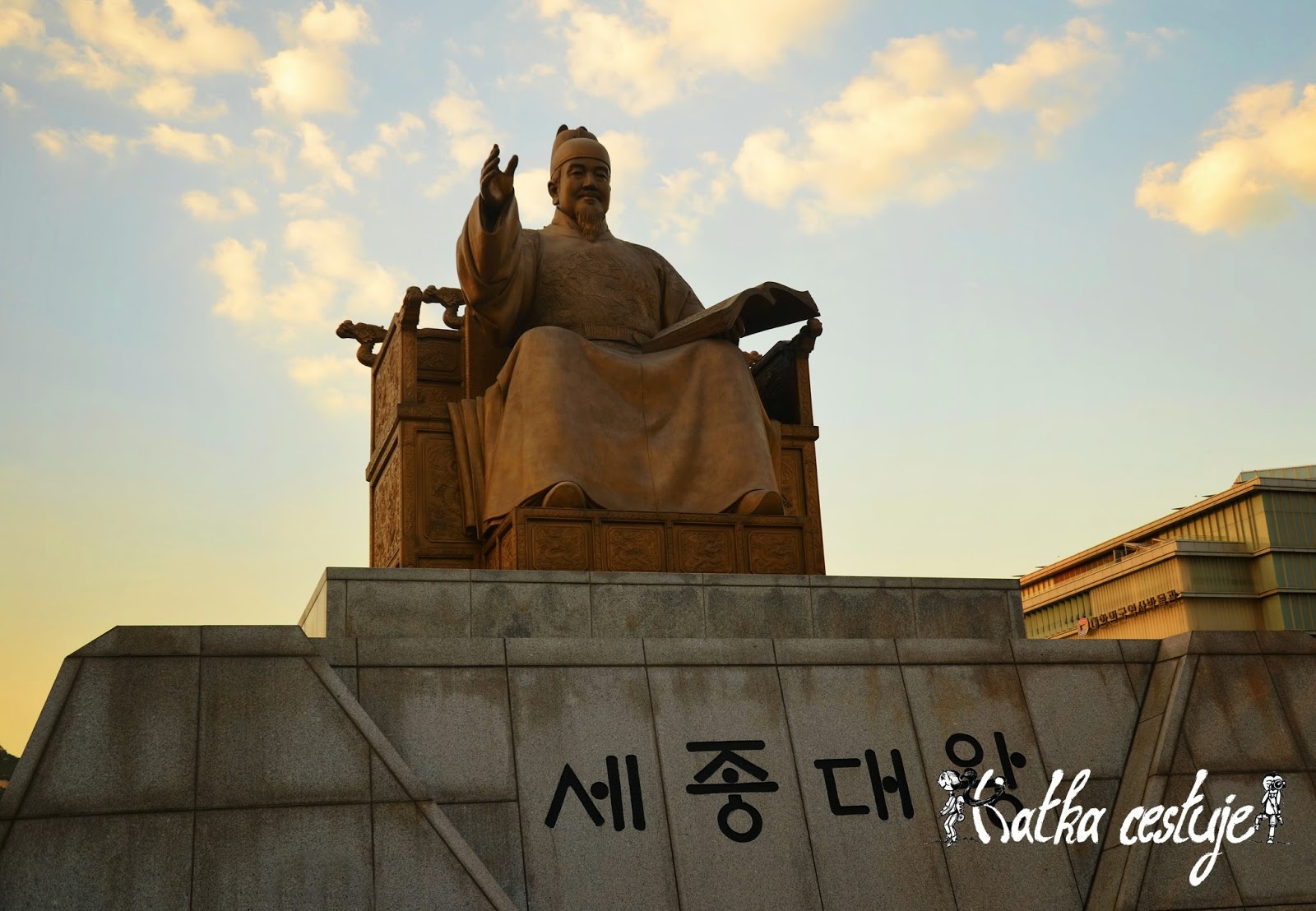 Na velkém náměstí rár metrů před palácem Gyeongbuk nejde přehlédnout obří zlatou sochu krále Sejonga sedícího na trůně. Toto místo ale skrývá mnohem víc než se na první pohled zdá, i když je to podle mě až trochu moc pečlivě ukryto. Procházela jsem kolem něj několikrát ale asi až třetí den jsem zaznamenala schody zezadu památníku. Nejdříve jsem jim nevěnovala pozornost, protože jsem se domnívala, že vedou na záchody. Dnes jsem si ale všimla, že od tam vychází podezřele moc lidí a tak jsem dovnitř také zvědavě nakoukla. Místo smradlavých záchodů mě tu ale čekalo něco naprosto jiného! Rozlehlé prostory nabízející moderní výstavu o životě významného korejského vládce, krále Sejonga! A tak jsem se velmi nečekaně téměř hodinu procházela tímto podzemním muzeem a pozorovala nejrůznější exponáty od starých děl a dřevěných hudedních nástrojů až po nejmodernější digitální projekce. Moc milé překvápko!