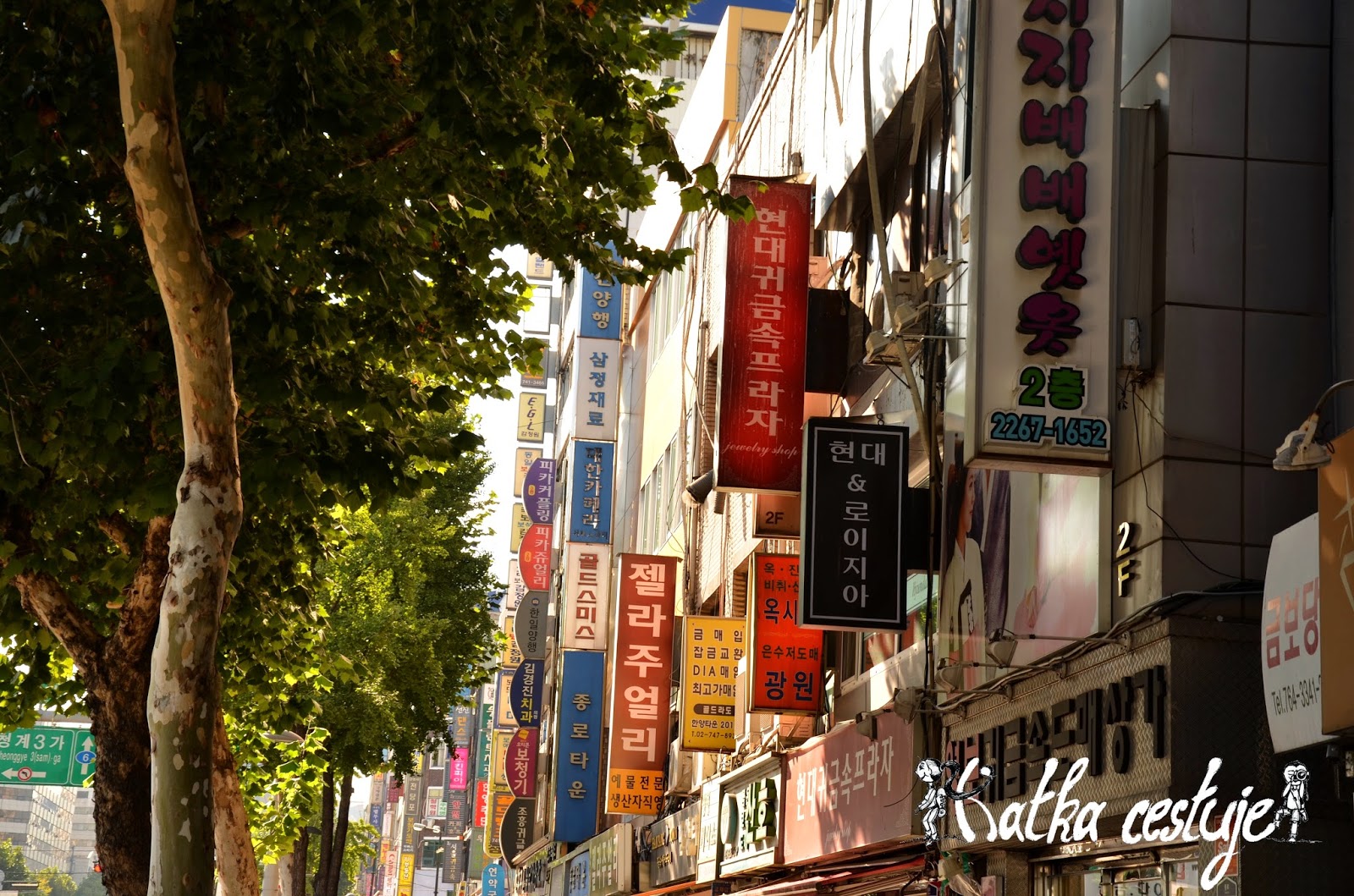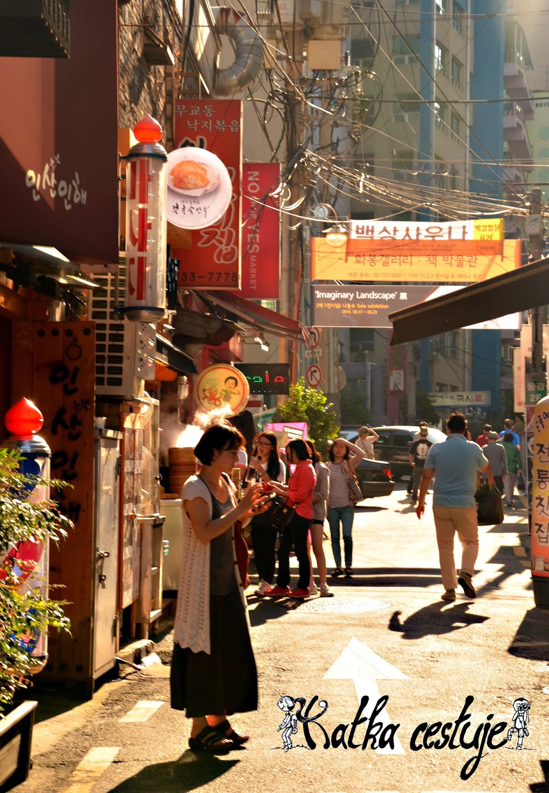 Tato čtvrť vznikla původně sloučením dvou malých městeček In a Sa. Dnes je rozlehlou městskou částí, kde můžou turisté jako já okusit atmosféru každodenního současného Soulu a nakoupit si cokoliv je napadne. A tak jsem se tu prodírala davy dalších turistů v úzkých uličkách plných nejrůzněšjích stánků, bufetů, nákupních center, čajoven, galerií, starožitnictví a i spousty neidentifikovatelných obchůdků. S tou identifikací to totiž opravdu nebyla sranda, protože mimo největší centrum tu latinská písmena moc nenarazíte a jak jsem brzy překvapivě zjistila, s angličtinou to tu úplně slavné také není. Koupit si tak dobrý oběd se stalo náročnou bojovkou, protože ať jsem do menu či tabulí s nabídkou jídel mžourala sebevíc z korejských klikiháků jsem nic nevyčetla a na otázku, co to jídlo je jsem dostala korejskou odpověd nebo pozitivní usměvavé „Yes!“, které ale mé otevřené otázky zrovna dvakrát neuspokojilo. Párkrát jsem tedy zaexperimentovala, ale vždycky jsem na talíř dostala něco úplně jiného než jsem očekávala a bohužel ani nevěděla, co to je, natož jak to jíst. A tak jsem poslední dva dny trávila na sendvičích, za což by mě milovníci korejské kuchyně jistě ukamenovali :).