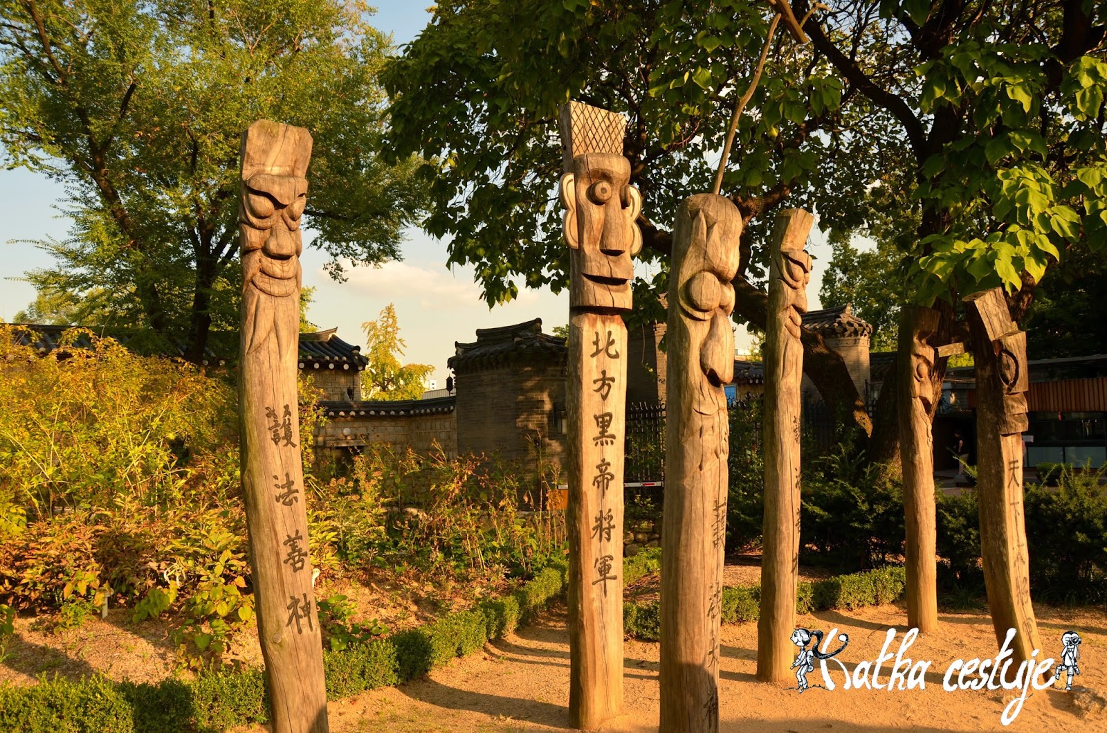 Korejské folklórní muzeum se nachází v areálu paláce Gyeongbokgung a mapuje historii a tradiční životní styl korejského národa. Má tři hlavní budovy a exhibice – History of Korean People vystavující exponáty z běžného života Korejců od prehistorických dob až po současnost, Korean Way of Life ilustrující korejské vesničany ve starodávných dobách a Life Cycle of the Koreans osvětlující hluboké kořeny konfucianismu a vliv této ideologie na celou korejskou kulturu. Areál je vážně obrovský a uvnitř budovy se mi opět povedlo zabloudit a nemohla jsem najít východ ven, což se mi tu stalo už podruhé (poprvé v šestipatrové soulské knihovně). Součástí muzea nejsou jen interiérové expozice, ale také rozlehlé venkovní prostory, kde jsem obdivovala například obří modelu čínského horoskopu, obří kamenné pagody či starodávné dřevěné chatrče. Prošla jsem se tu také „uličkou vzpomínek“, která je lemovanou replikami budov, obchůdků, kaváren typickými pro korejský životní styl v letech 1970-1980. Mohla jsem tak nakouknout do stylového kadeřnictví, prodejny starých komiksů či retro obchodu s gramofonovými deskami. Pak tu samozřejmě byla spousta zvláštních věcí, srandovních totemů a předmětů, kterým jsem vůbec nerozumněla :).