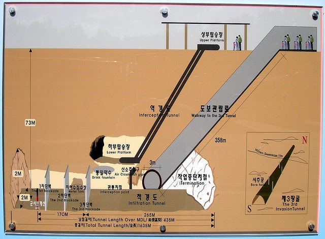 Za chvíli už se s autobusem dostáváme k hraničnímu přechodu do samotné demilitarizované zóny. Tady musíme vytasit své pasy a předložit je přísnému vojákovi, který prochází autobus a kontroluje naše identifikace. Tak nějak nevím, jestli je celé toto drama seriózní nebo jen součást zážitkového balíčku pro turisty. Za několik dalších minut zastavujeme u první velké atrakce – Třetího infiltračního tunelu, zvaného také Third tunnel of Aggression. Ten byl objeven v říjnu roku 1978 na základě informací od jednoho přeběhlíka. Je 1,7 km dlouhý, 2 metry široký, 2 metry vysoký a klesá až do hloubky 73 metrů. Pokud se vám v davech turistů zatím podařilo zapomenout na realitu hrozby ze severu, tady vám ztuhne úsměv na rtech. Tunel byl totiž v přísném utajení vybudován severokorejskou armádou jako prostředek k překvapivému útoku na samotný Soul. Jeho útroby by bez problémů umožnily třicetitisícům ozbrojených vojáků za hodinu přeběhnout do Jižní Koreji. Severní Korea ale vybudování útočného tunelu popřela a oficiálně ho označila za součást uhelného dolu. Aby bylo jejich tvrzení důvěryhodnější, pomalovali jeho stěny černou barvou. Nic naplat, že geologické výzkumy existenci uhlí v tomto horninovém podloží naprosto vyloučily, Severní Korea si prostě dál jede svoje. Infiltrační tunely byly v DMZ nalezeny celkem čtyři (poslední v březnu 1990), a tak jihokorejská armáda společně s americkou pravidelně podniká důkladné průzkumy, jestli totalitní Korea opět nedoluje „uhlí“.