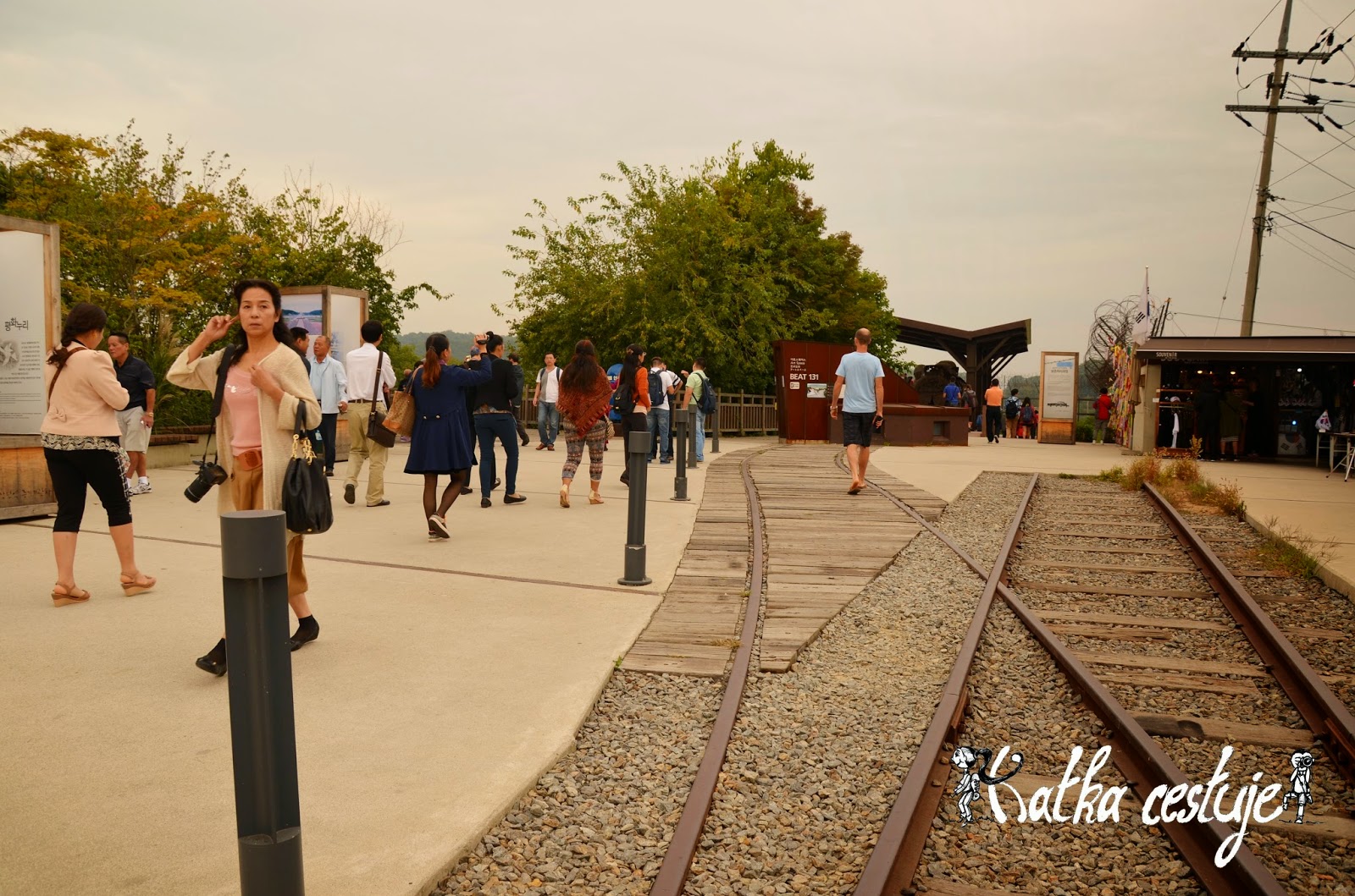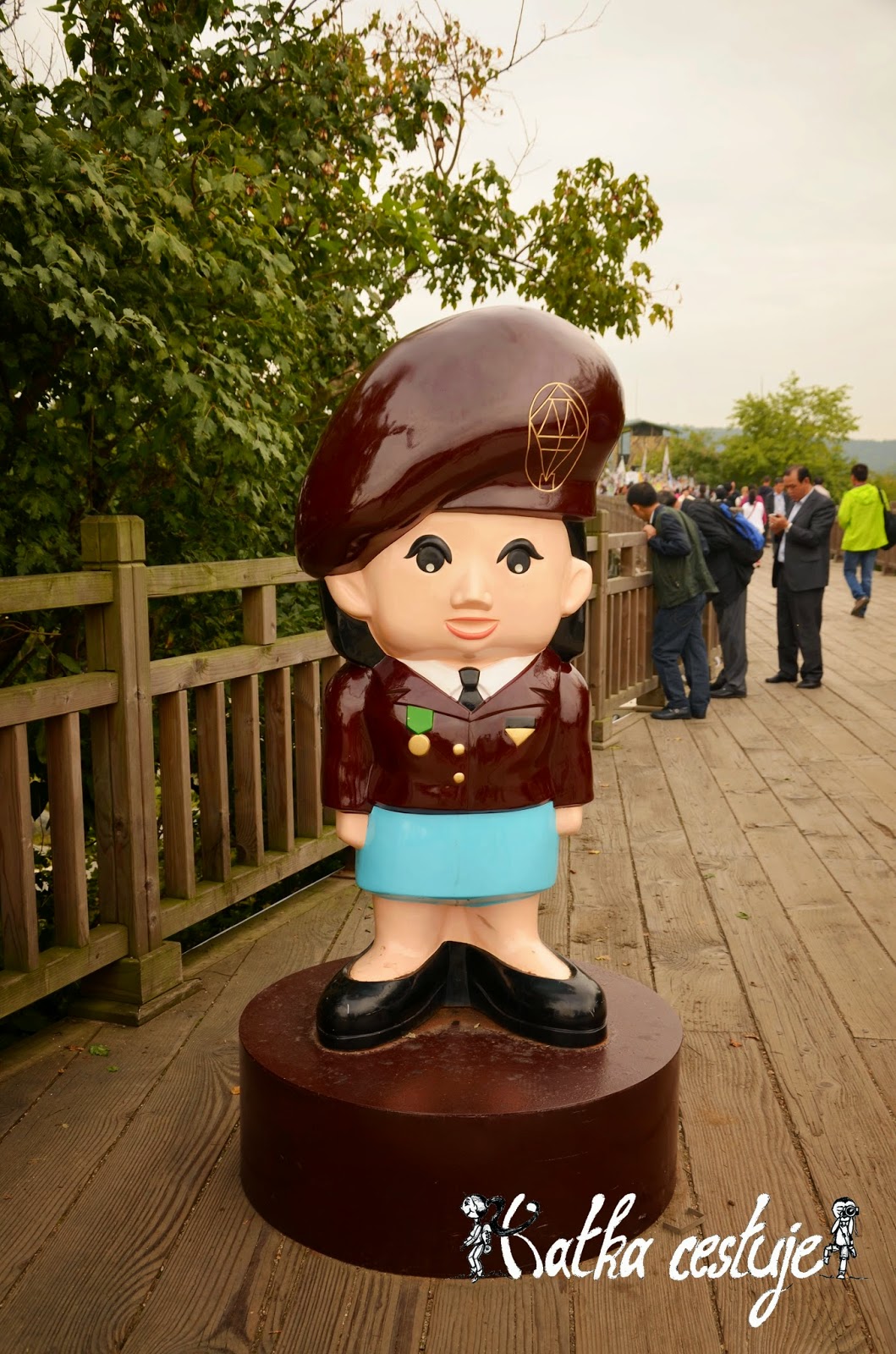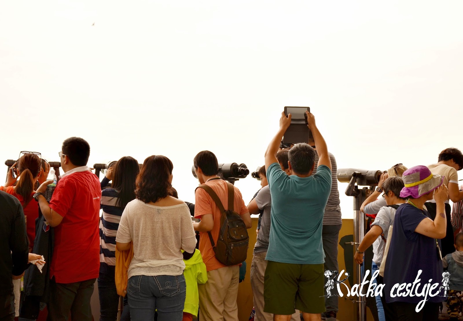 Z vyhlídky je tu možné nahlédnout do Severní Koreji a za malý poplatek k tomu můžete dokonce použít dalekohledy umožňující detailnější průzkum. Na tento okamžik jsem se těšila dlouho, až budu naživo hledět do této komunistické země a přemítat, co se za těmito horami asi zrovna děje za hrůzy. Realita je ale poněkud jiná. Na vyhlídce jsou lidé z asi pěti autobusů a dostat se tak k zábradlí, odkud je možné něco vidět, chce opravdu ostré lokty a velkou trpělivost.