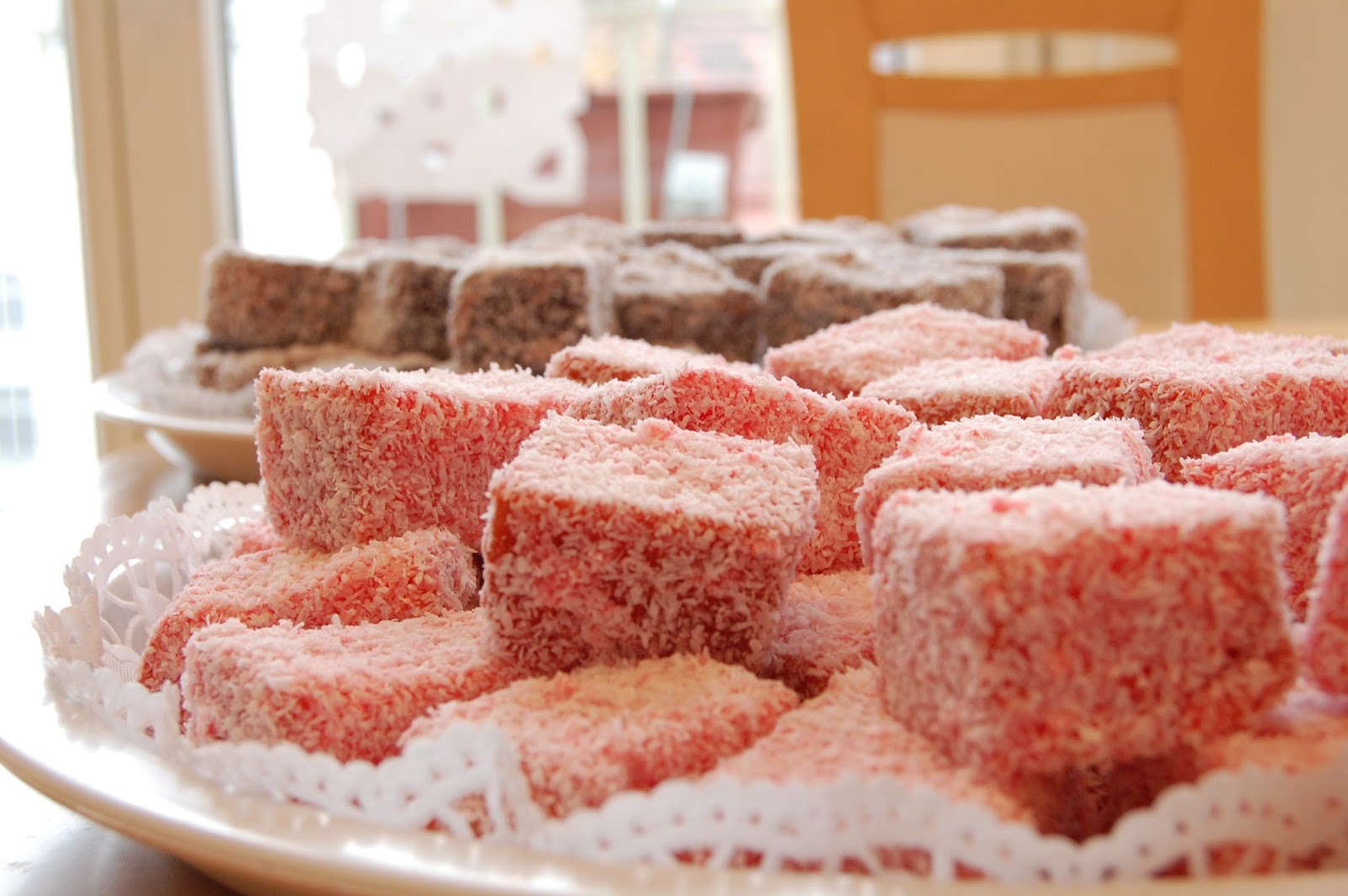 I když klasické lamingtonky pocházejí z Austrálie, jejich růžová, jahodová varianta je spojována se Novým Zélandanem. Při hledání informací jsem dokonce narazila na článek o starém obrazu dokazující, že tento piškotový dezert přece jen pochází původně z NZ. Je to vlastně piškotový dort obalený v čokoládě či jahodové polevě posypaný kokosem většinou ve tvarů malých čtverečků či obdelníčků. Populární při všemožných příležitostech.