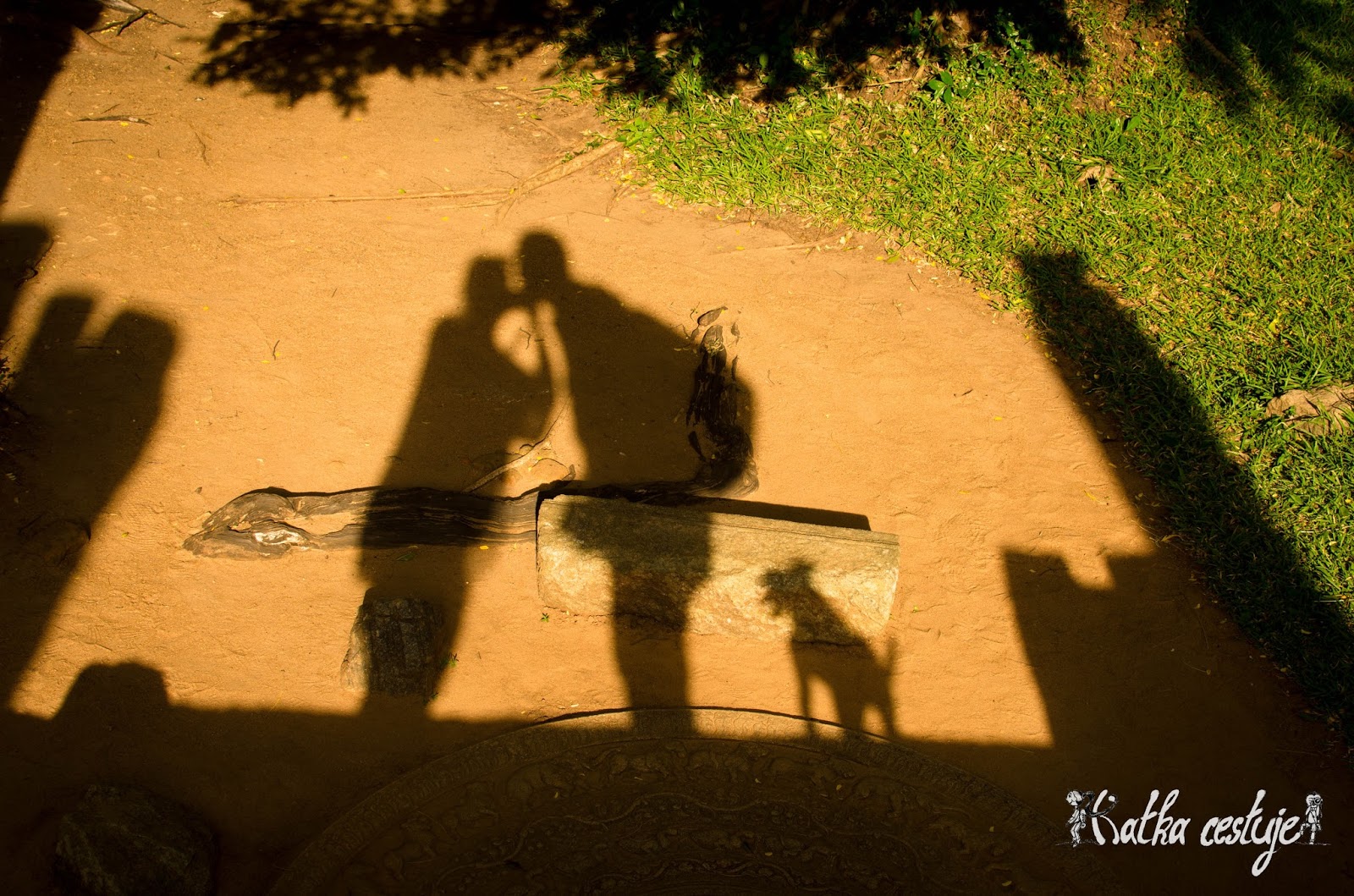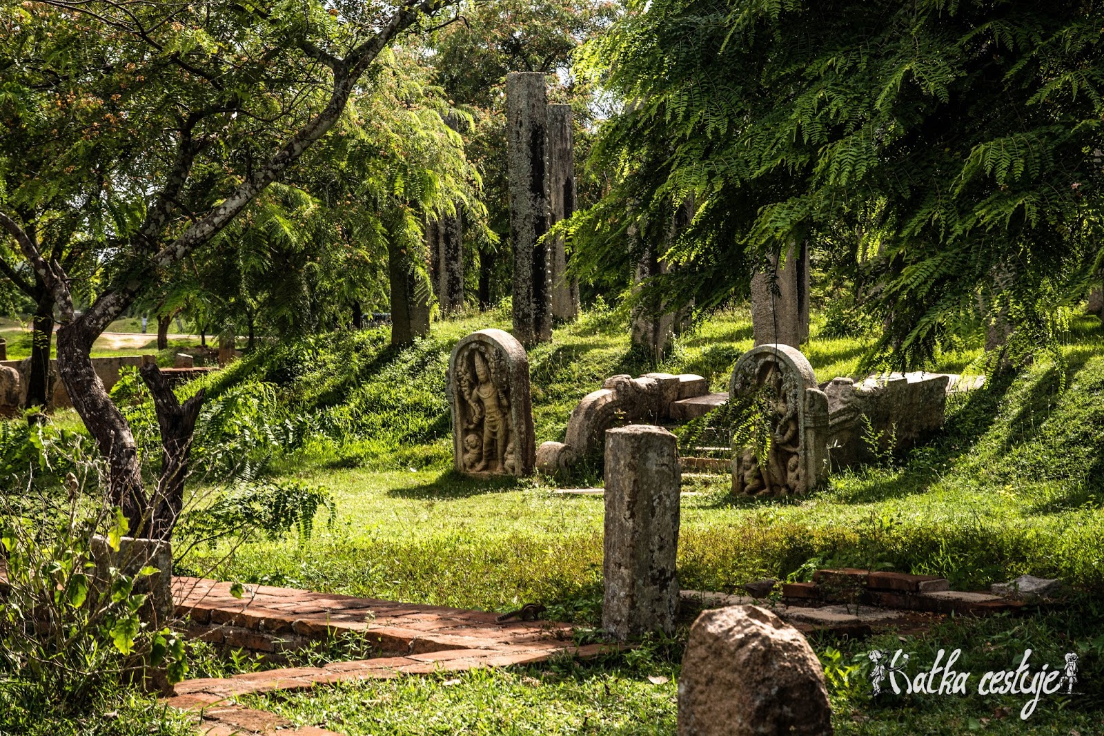 Po dalších třech vyčerpávajících kilometrech přijíždíme do nejvzdálenější části komplexu, kde stával klášter Abhayagiri. Přijíždíme sem už úplně uvaření a jediné, co chceme je VODA! Okamžitě, jak sundáme nohy z pedálů, se na nás sesypou prodejci všemožných cetek a suvenýrů a já už mám v tuto chvíli chuť je vážně poslat někam. Dejte nám dvě minuty na to si vydechnout! Voda je tu ale cenější než zlato, tudíž tu není, a tak si každý kupujeme kolu (kolikátou už dneska??). S naší novou nejlepší kamarádkou, vychlazenou skleněnou lahví v ruce, se jdeme podívat na ruiny Mahásénova paláce. Z těch tu toho opravdu moc nezbývá až na krásný zachovalý měsíční kámen (Moonstone I.) z 8. století s pěti kruhy zobrazujícími duchovní cestu k nirváně. Pozoruhodné jsou také přiléhající schody, které zdobí vytesávaní trpaslíci a Ratna Prasanda, nejzachovalejších strážný kámen v Anuradhapuře.