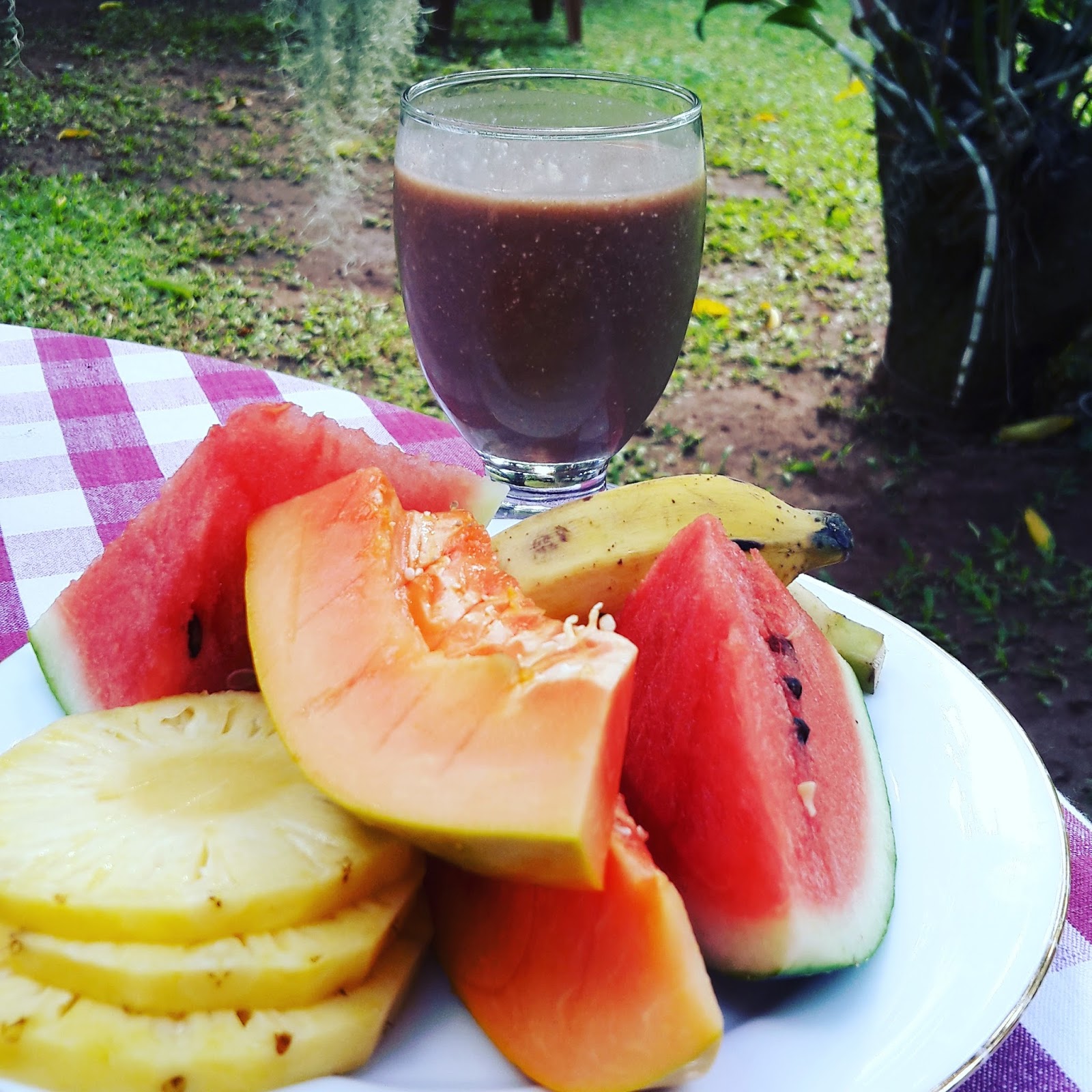 | čerstvá ovocná snídaně a džus z „dřevěného jablka“ |