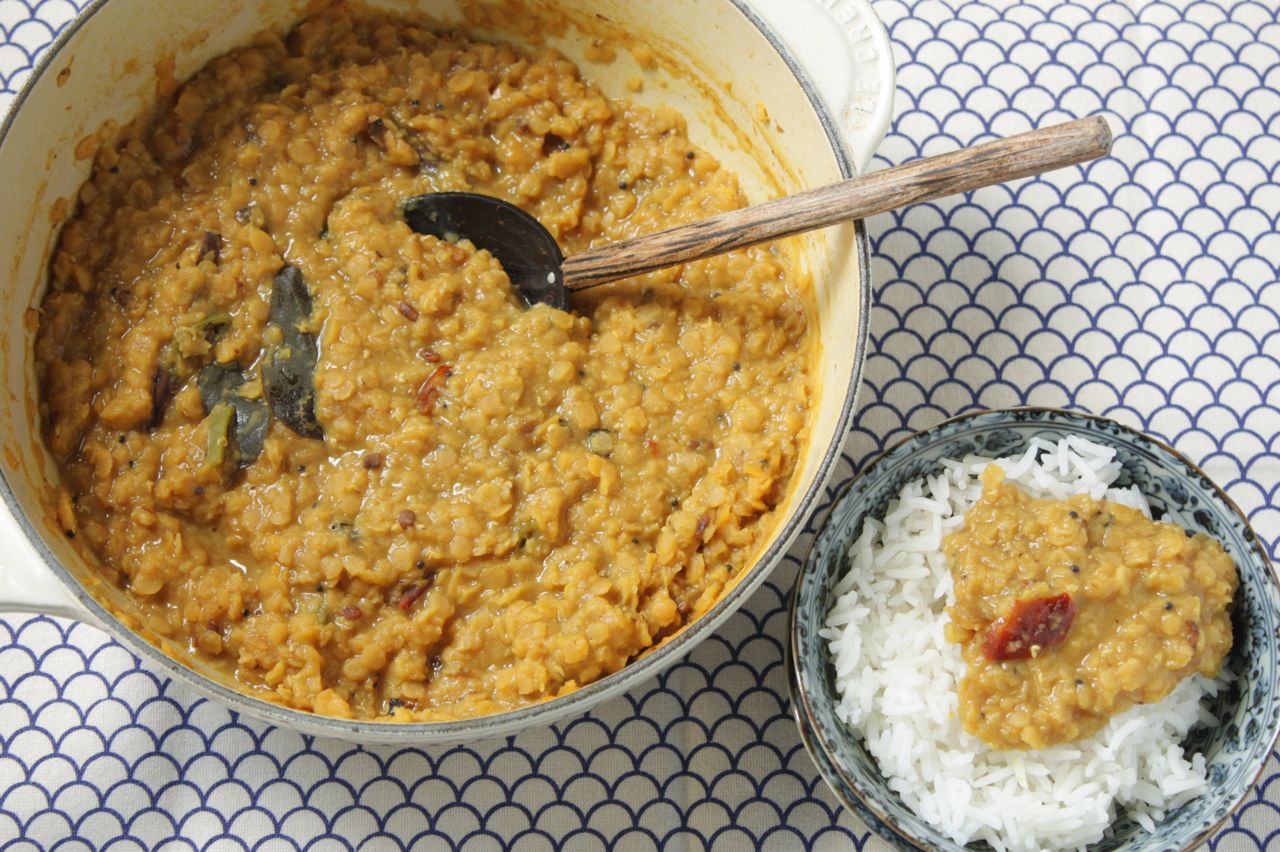Ingredience: červená čočka, kokosový krém a kokosové mléko, zelené chilli papričky, česnek, cibule, kari koření, kmín, hořčičná semínka, skořice, kari listy, pepř