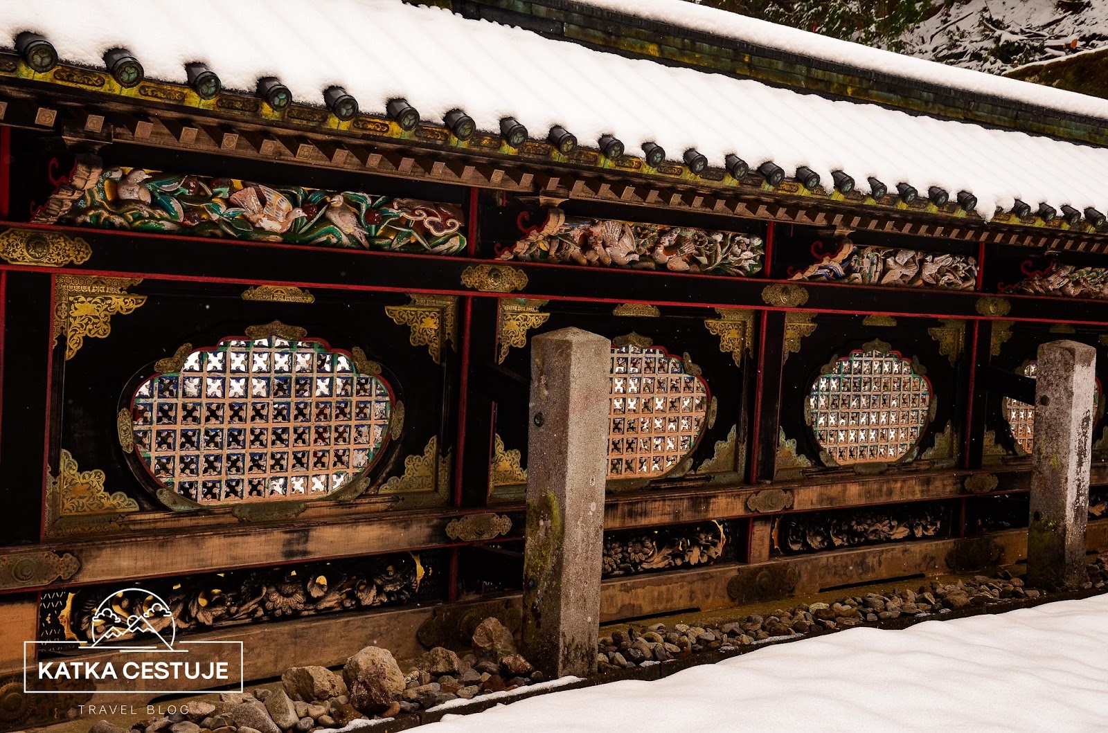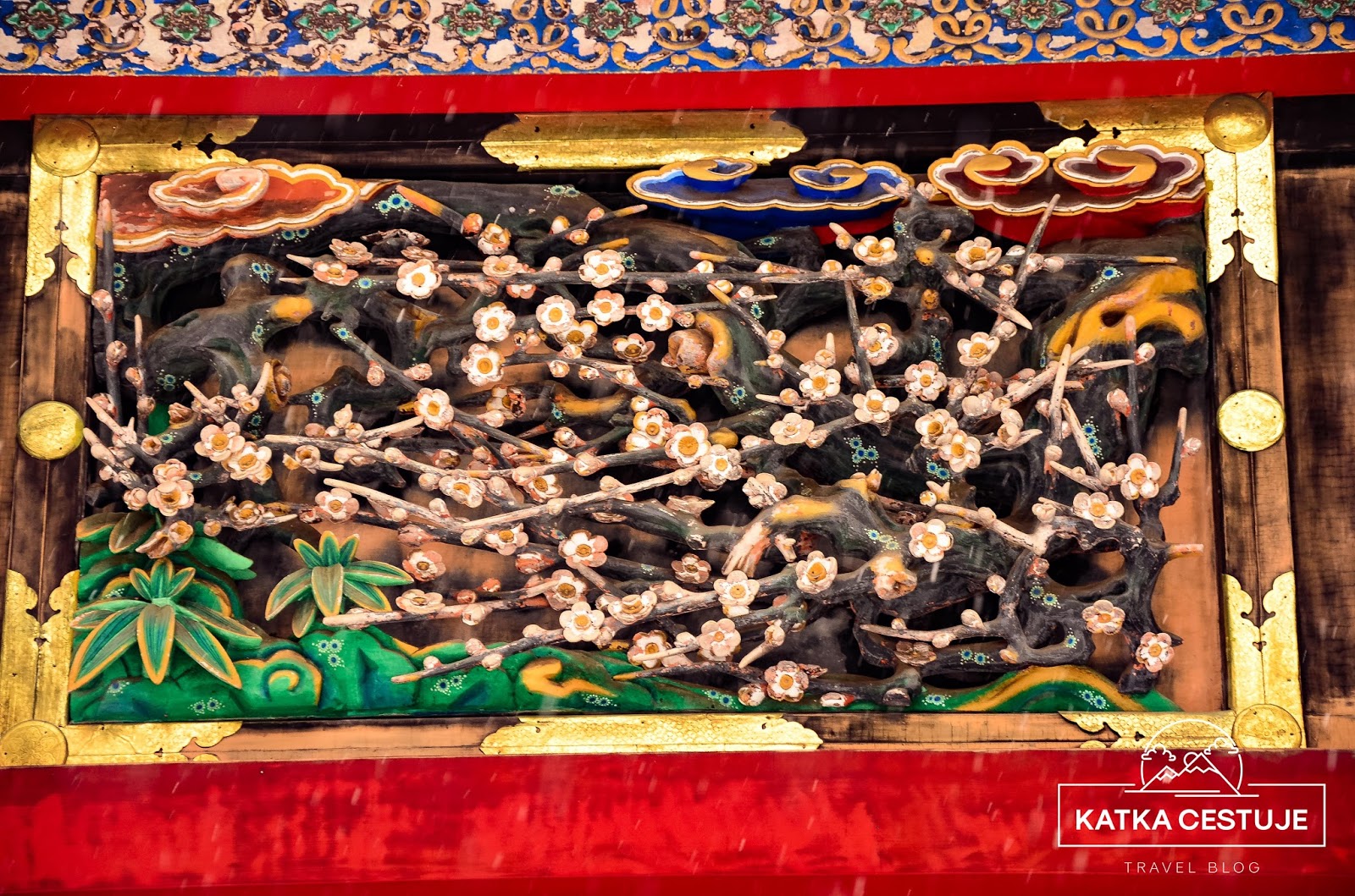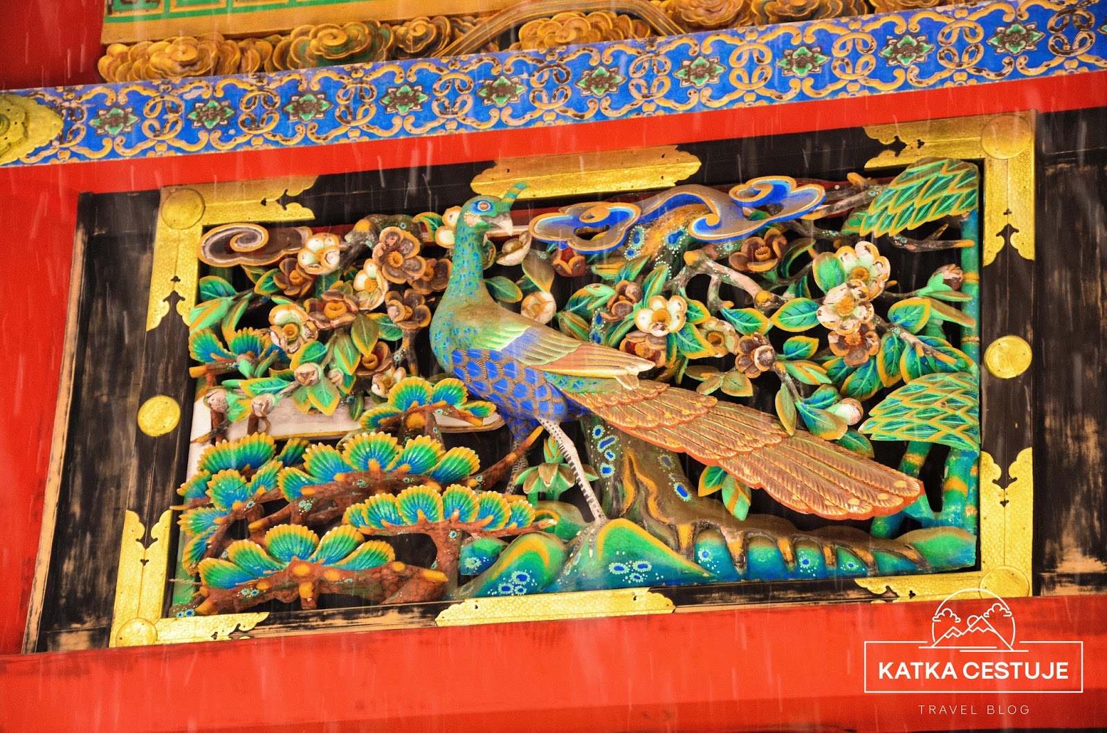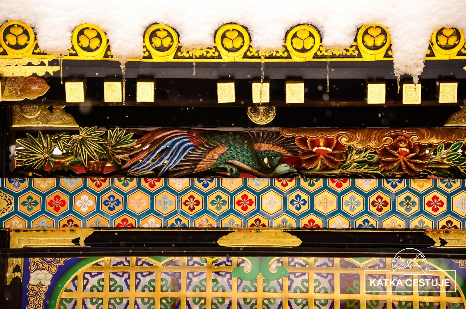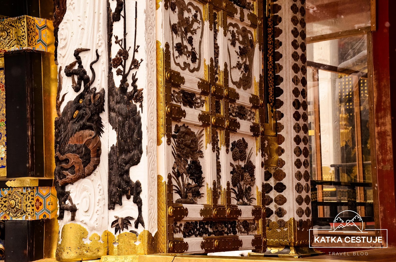 Největší dominanta celého Tóšógú komplexu, hlavní brána Jómei-mon, byla bohužel v době naší návštěvy v rekonstrukci, takže schovaná za plachtou. O to víc jsme se ale zdrželi koridoru Kajro, jehož vnější zdi nalevo i napravo od brány jsou zdobeny skvostnými řezbami květin a ptáků. Jsou považovány za nejlepší v celém Japonsku a na každou z nich by se dalo koukat hodinu. Řezbářské umění tu nabývá úplně nového významu. Posuďte sami.
