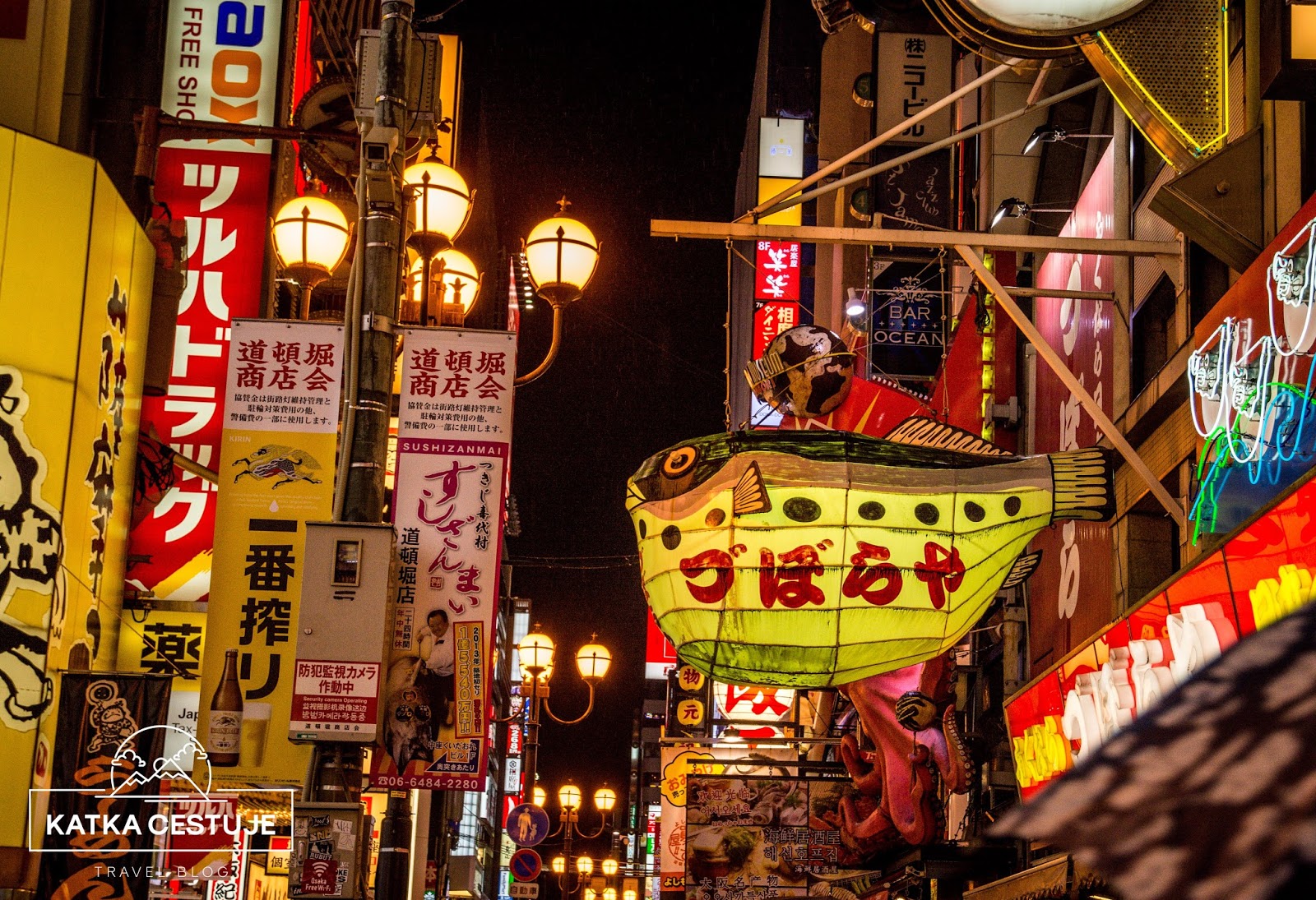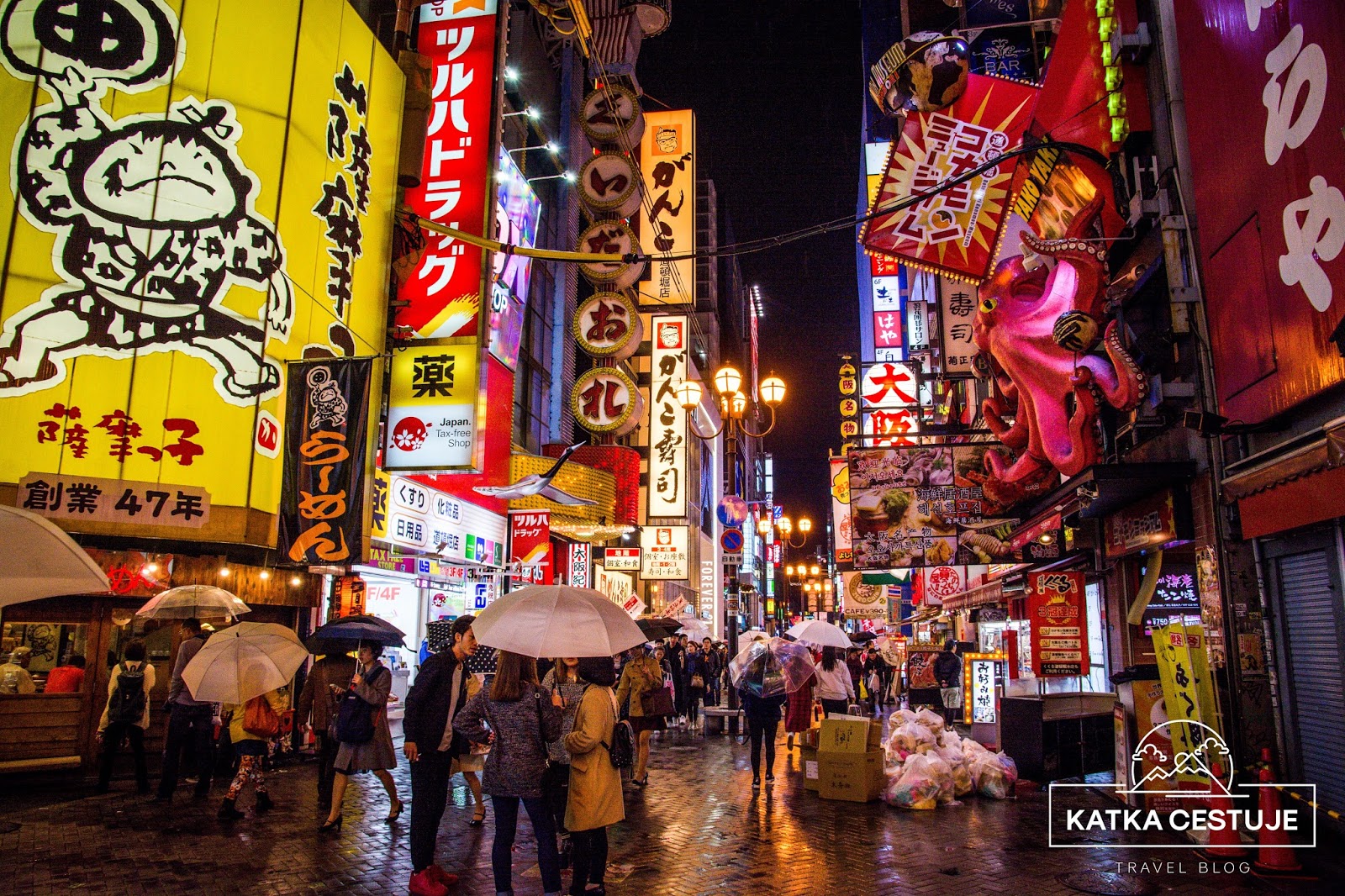 Protože máme na Ósaku jen jeden večer, ze všech místních atrakcí vybíráme uličku Dotonbori, která je považovaná za srdce města a kulinářský ráj. Z naší zastávky Shin-Imamya jedeme jen asi 5 minut metrem do stanice Namba, odkud je to na Dotonbori dalších pět minut. Dotonbori je jedna dlouhá ulice vinoucí se podél Dotonborského kanálu mezi mosty Dōtonboribashi Bridge a Nipponbashi Bridge v městské části Namba. Dříve divadelní čtvrť je dnes známá především pro svůj noční život a zábavní charakter, soupeří tu spolu nespočet restaurací, obchodů, pačinko hern a karaoke barů. Tato atmosféra je dokreslená desítky neonových bilboardů a světelných reklamních tabulí. Dneska nám navíc pěkně poprchá a mokrá silnice plná kaluží tak celou tuto barevnou parádu krásně odráží jako v zrcadle.