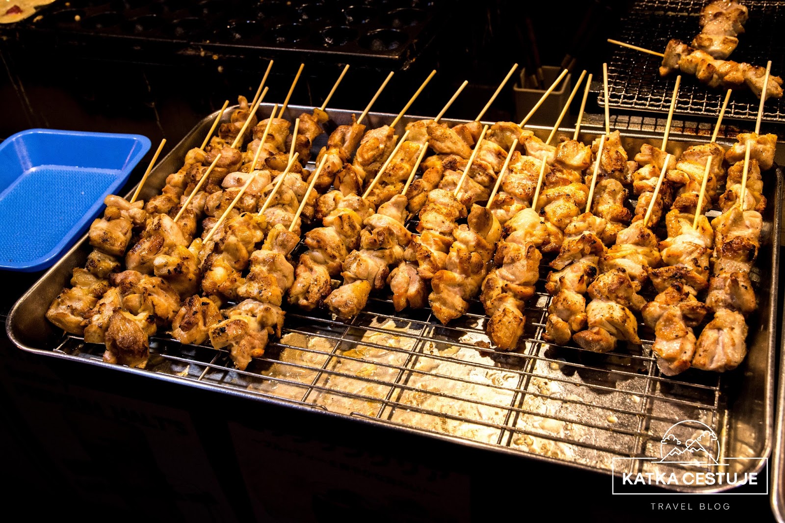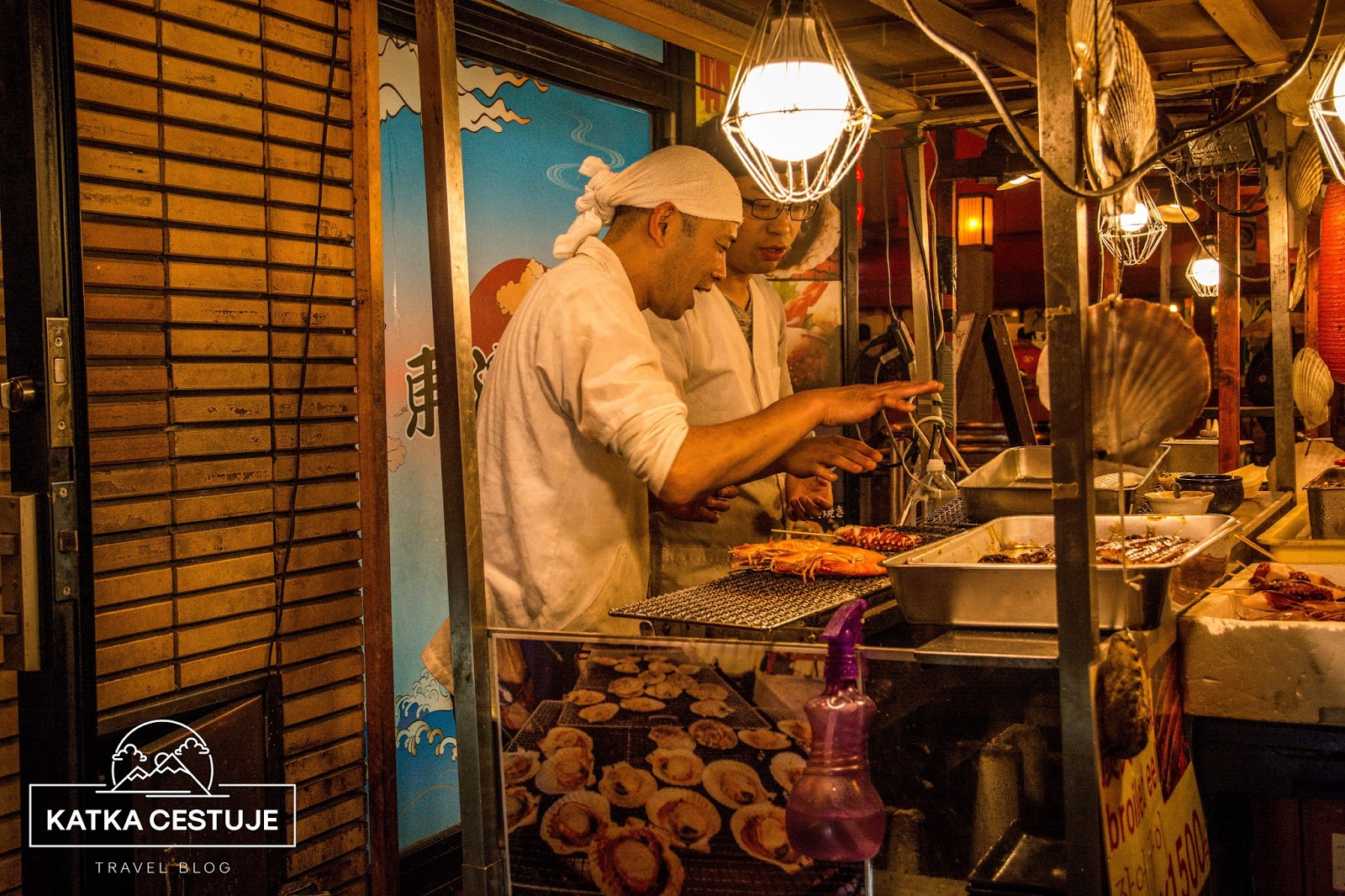 Má to ale jeden háček. Je tu toho tolik a vy si musíte vybrat, jinak byste vážně vyjedli váš bankovní účet nebo možná, ještě hůř, se užrali k smrti. Vybrat si můžete z nesčetně druhů restaurací, sushi barů či pouličních stánků, stejně tak jako z širokého rozmezí finanční náročnosti. Ochutnat tu můžete třeba krevety a mušle na špejli nebo místní specialitu, chobotnicové koule takoyaki. Ano, čtete správně. Tako- znamená chobotnice, -yaki na grilu. Nejlepší místo, kde tuto dobrotu ochutnat je stánek Otakoya asi uprostřed ulice. Můžete tu přímo sledovat, jak se těstíčko s nasekanými kousky chobotnic, jarní cibulky a červeného zázvoru smaží na grilu do tvaru kuliček. Hotové koule se potom prodávají většinou po šesti kusech za zhruba 300 jenů, polité omáčkou okonomiyaki, majonézou a posypané vločkami sušeného tuňáka katsuobashi, které se horkem na tácku krásně kroutí. Takoyaki je ale ďábelské jídlo, tekuté těstíčko je tak horké, že se skoro nedá jíst, ale jakmile vychladne, není už zase tak dobré :-). A tak poslušně srkáme a dobrovolně si pálíme pusy od chobotnicových chapadel.
