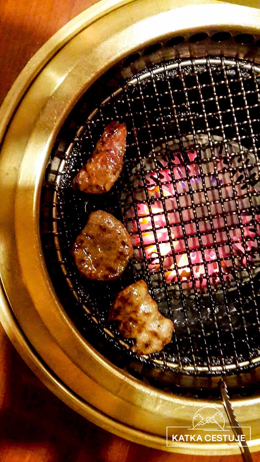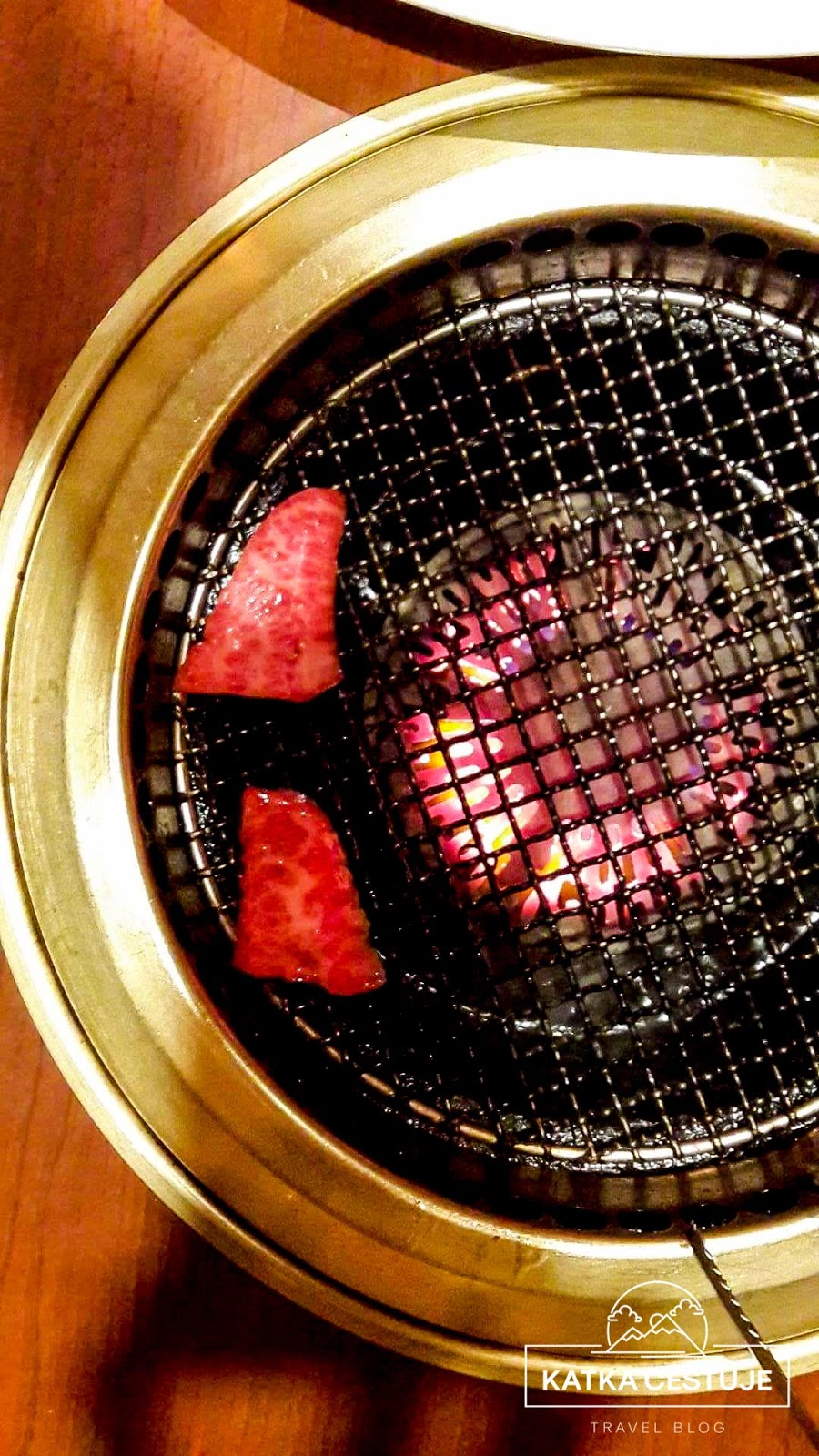 Ochutnat vyhlášené hovězí z Kóbe bylo na našem japonském gastro-bucket listu od chvíle, co jsme viděli neuvěřitelné video našeho oblíbeného food bloggera Marka Wiense, návštěvu samotného města Kóbe jsme nestíhali, takže nejlepší příležitost byla právě tady, v jen 35 kilometrů vzdálené Ósace. Hovězí z Kóbe (angl. Kobe beef) pochází z černých krav a býků plemene wagyu, kteří se rodí a chovají na farmách v okolní prefektuře Hyógo. Toto plemeno má maso s nádherným výrazným mramorováním s velmi vysokým poměrem tuku ke svalovině. Toto mramorování se potom oceňuje na dvanáctistupňové škále. Čím je větší poměr tuku, tím má maso lepší chuť – a tím je také dražší. Kóbe beef je nejdražším masem na světě, takže jsme museli zvolit nějakou rozumnou variantu. Vybrali jsme si tedy jednu z levnějších restaurací zaměřených na tuto specialitu a doufali, že to bude stát za to. Stálo! Z menu jsme si vybrali degustační talíř s pěti druhy/kvalitami masa a s napětím čekali, co nám přistane na stole, který má uprostřed hořák s grilem.