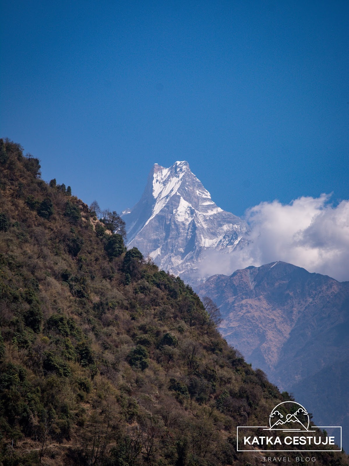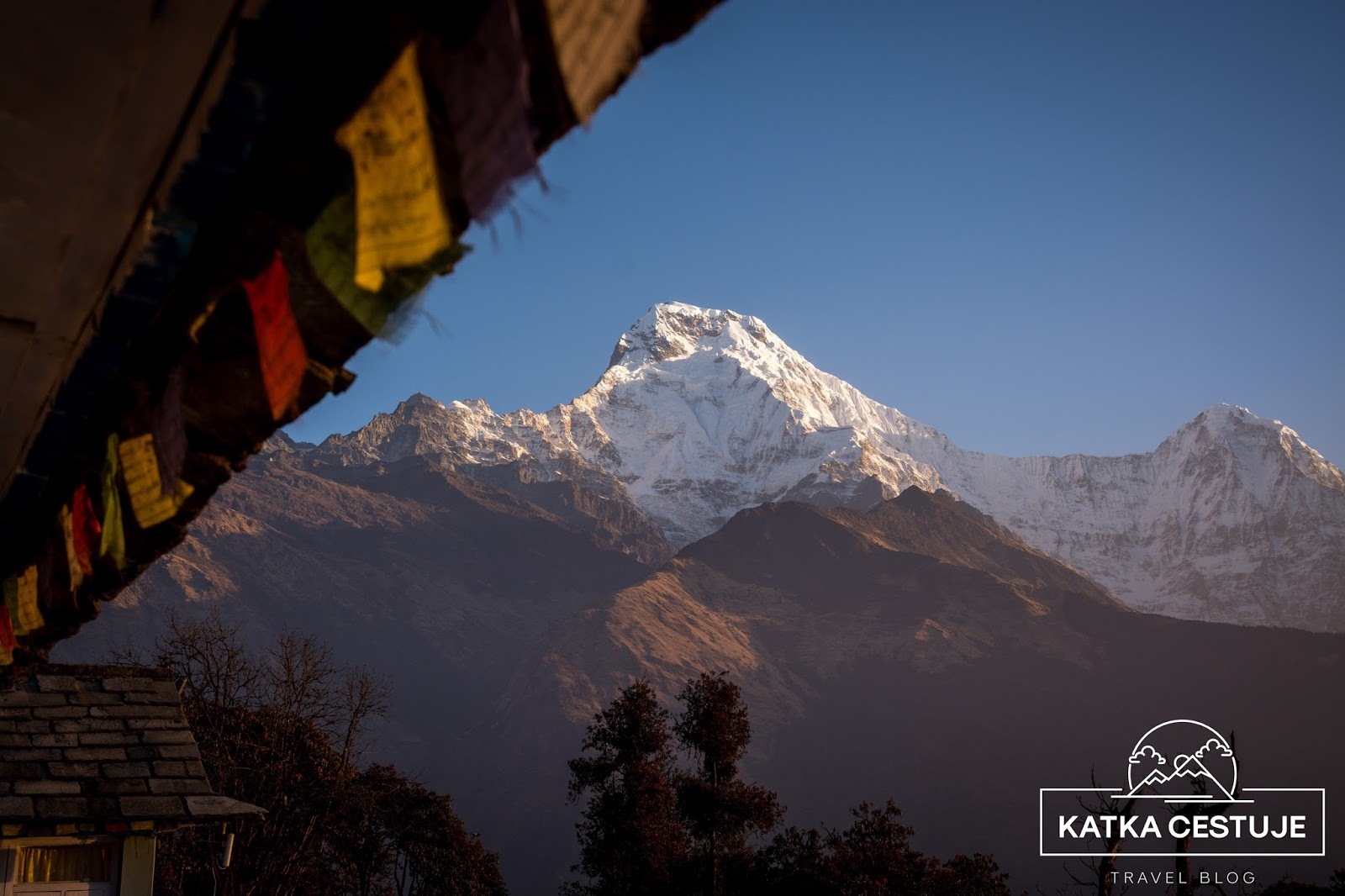 Jednou z nejkrásnějších věcí na horách jsou východy slunce, a ten v Tadapani, ten stál vážně za to. Jak už jsem se zmiňovala v předchozích článcích, hora, která mě v Himaláji nejvíc uhranula nebyla slavná Annapurna, ale Mačapučare (angl. Machapuchare) neboli Fishtail. Tenhle vrchol si mě naprosto získal už na obrázcích, které jsem si prohlížela před cestou do Nepálu. Nejdřív jsem si dokonce myslela, že je to fotomontáž, jak moc se mi tahle hora zdála nerealistická. Její rozeklený vrchol připomínající tvarem rybí ocas (podle čehož dostala také své jméno) působí v krajině opravdu teatrálně.