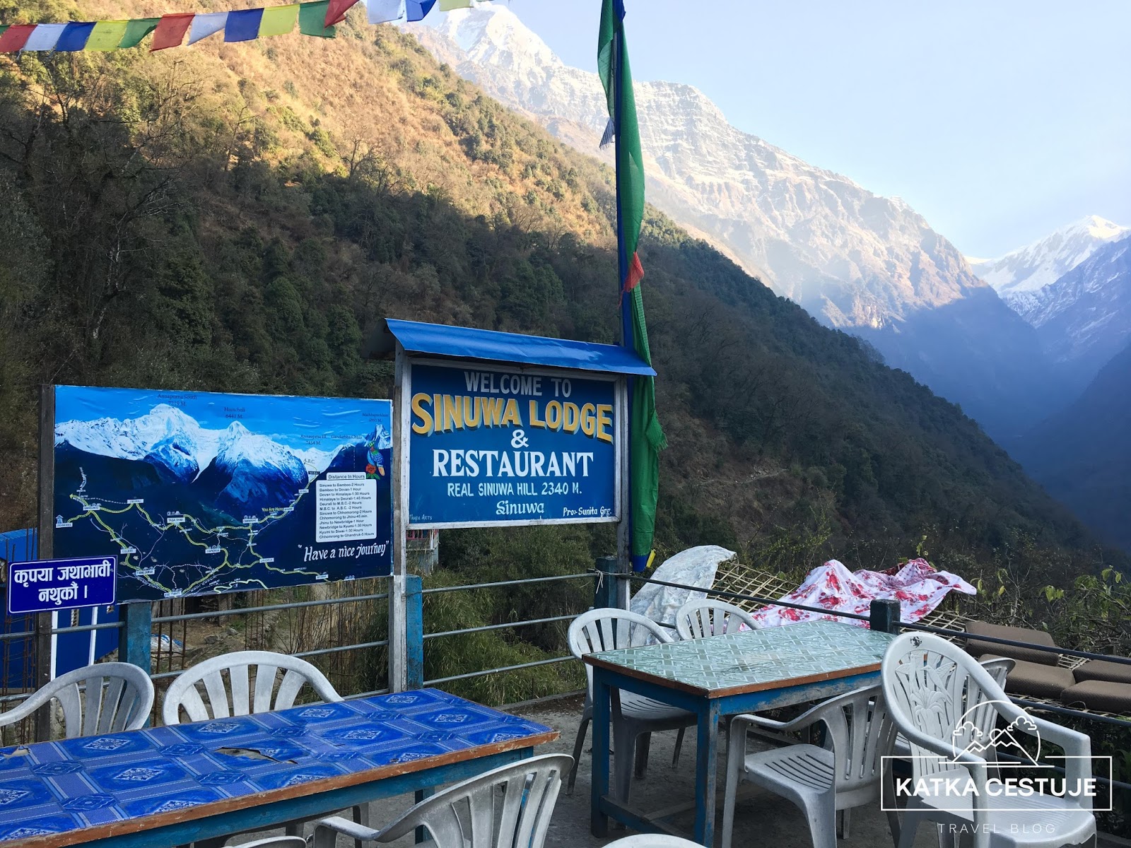 Za asi hodinu cesty jsme v lower sinuwa, odkud statečně pokračujem dál a tradá za 45 min jsme v cíli – Upper Sinuwa! Dnes to byl fakt marast. Vybíráme jedno ze tří ubytek, dáváme si úžasnou teplou sprchu (kterou mi pan majitel osobně nastavuje a ukazuje všechny vychytávky, jak na ni). Sluníčko si na nás dneska vybralo svou daň, já mám úžeh, jak vyšitej, hořím jak oheň a do toho zimnice jak blázen a Tom je chudák pěkně popálenej. Hlavně ta ruka, co držela trekovou holi na slunečné straně svahu! Jauuu!