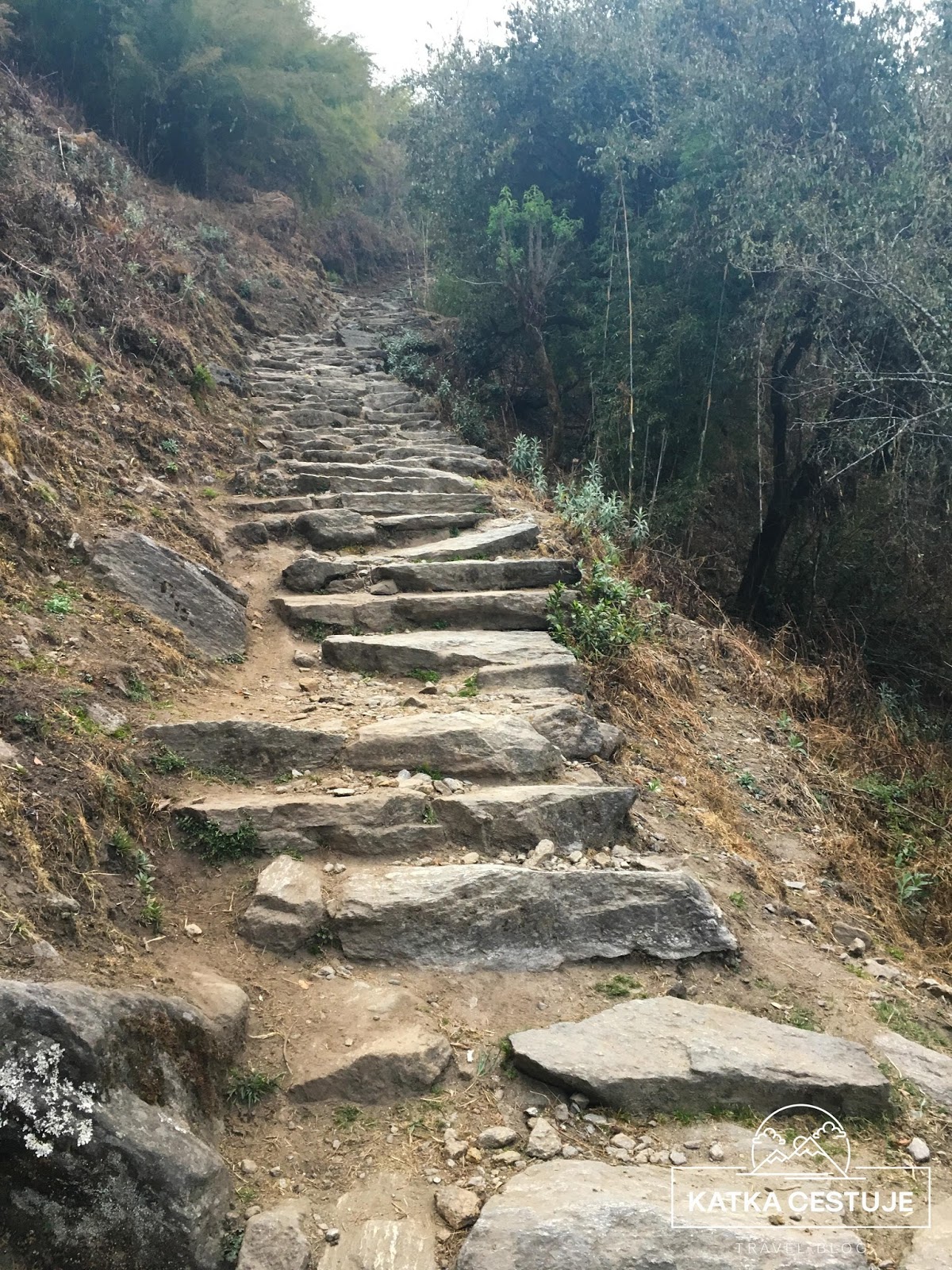 Tady ale prudký sešup nekončí, cesta pokračuje prudce dolů do údolí a my tak můžeme jen nevěřícně koukat na protější ostré svahy, které na druhé straně budeme šlapat zase nahoru. Tohle se ale snažíme už ignorovat, protože to bysme celý den nemohli přemýšlet nad ničím jiným… Holt jsme v Himaláji, a tak chodíme z kopce a do kopce. Snažíme si raději plnými doušky vychutnávat tento parádní výhled ze střechy světa a fascinovaně si prohlížíme okolní krajinu, která se s každým sešlápnutým metrem neustále mění. Nicméně, dolů to jde fakt dobře :-).