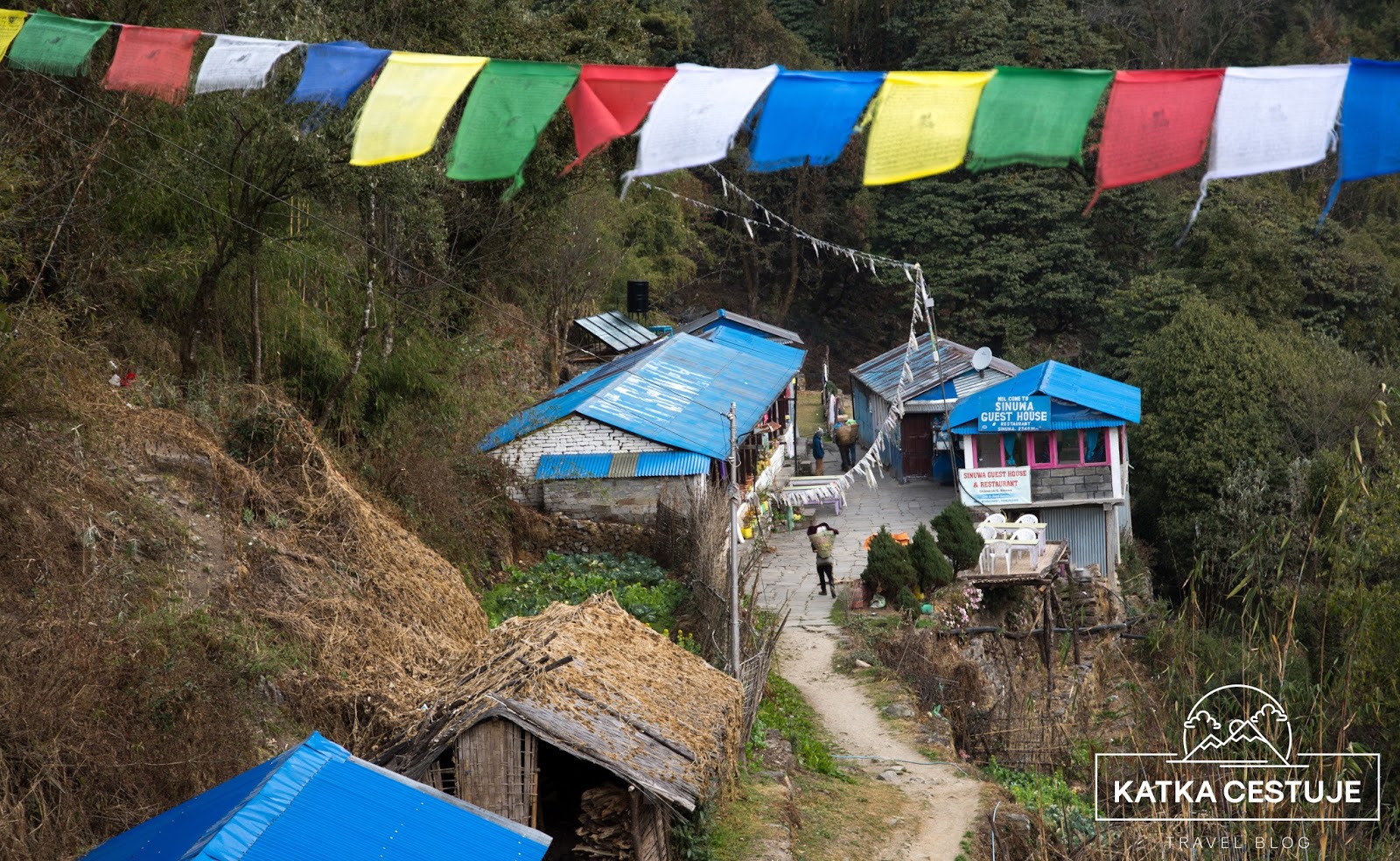 Ve 4 hodiny vítězoslavně docházíme do Deurali, kde poprvé nešpekulujeme a bereme hnedka první guest house – Panorama (tento název je v nepropustné mlze celkem vtipný). Tady už nás vítá vlhký ledově studený pokoj s ještě studenější společenskou místností, kde se balíme do ledových dek, které pěkně smrdí zatuchlinou, ale to je nám teď vážně šumák. Potřebujeme usušit oblečení, ale fakt tu není jak – o horkých kamínkách, která byla v tea housech dole se nám tu může jen zdát. Věšíme teda ty nejdůležitější kousky na šňůru a doufáme, že to do rána víc uschne než zmrzne.