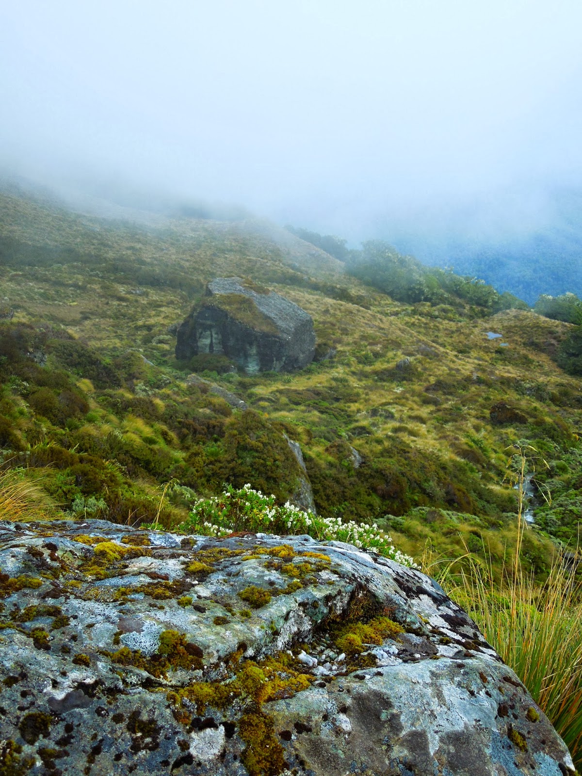 Další část trasy potom vedla neprostupnou mlhou a mžením, což byla na jednu stranu škoda, protože jsme toho moc neviděli, na stranu druhou jsme ale zažili ty pravé routeburnové podmínky a atmosféru. Následný pocit, kdy se nám po asi dvou hodinách v této mlze otevřel pohled na celé Hollyford údolí, byl opravdu dechberoucí a podle mě mnohem silnější, než kdybychom na to koukali celou dobu (navíc pro mě bylo možná dobře, že jsem ty srázy pod sebou předtím neviděla :-)). Mě dostal obrovský kus skály spadený v údolí, který vypadal úplně jako domeček a teprve díky jeho velikosti jsem si naplno uvědomila obrovskou rozlohu celého údolí a okolních fiordlandských hor.