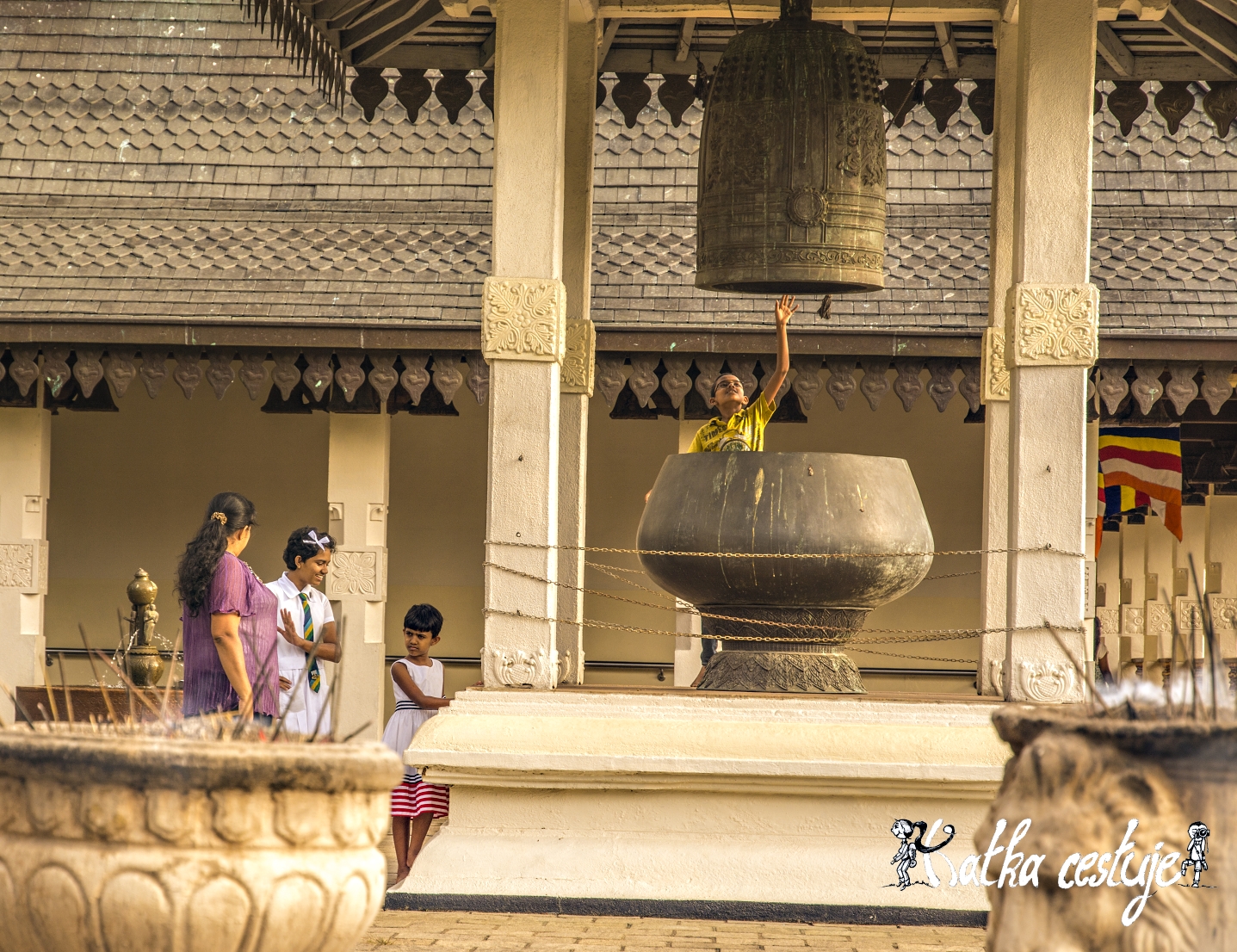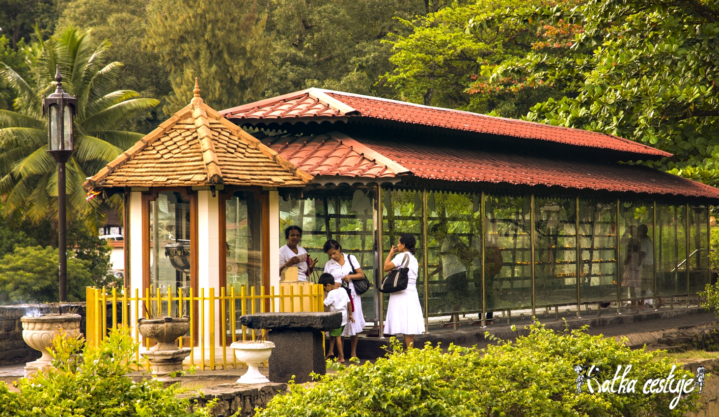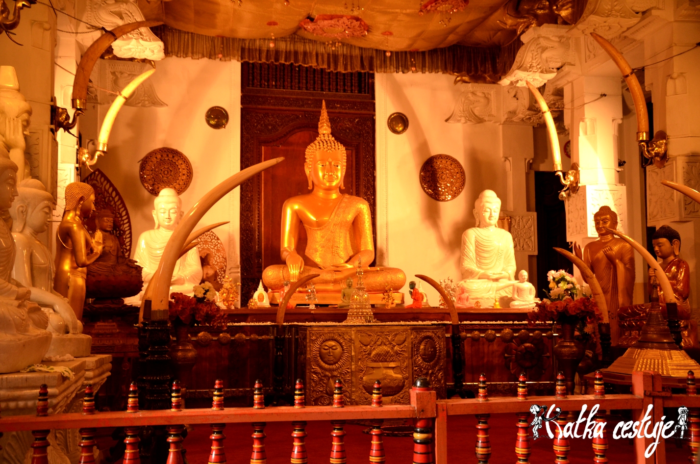 Další částí chrámu je Alut Maligawa, síň plná soch Buddhy a slonních klů, které jsou dary od jiných zemí. Série obrazů na stěnách síně znázorňuje příběh Buddhova zubu a mně silně připomíná obrazy křížové cesty Ježíše Krista, které jsou v českých kostelích.