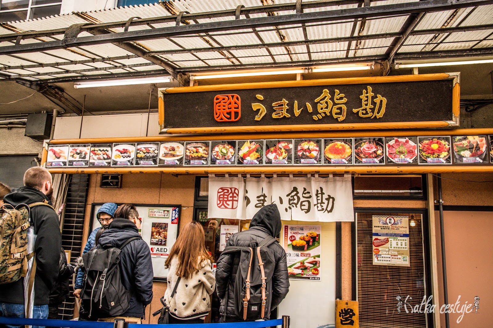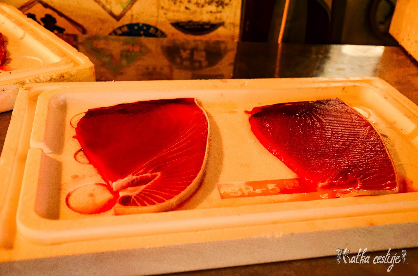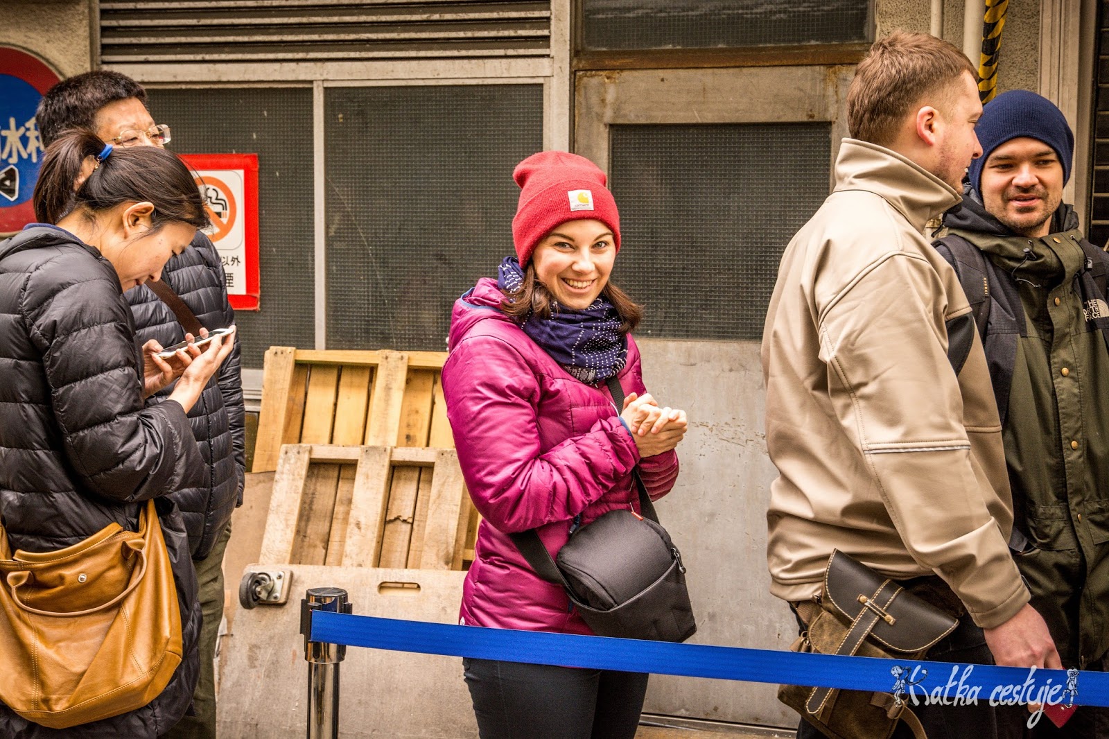 Druhý den v Tokiu nás probouzí zvonění budíku o trochu dřív, než bychom si přáli. Chystáme se totiž na návštěvu rybího trhu Cukidži (angl. Tsukiji), jehož brány se pro turisty otevírají v 9 hodin, a tak už o půl osmé opouštíme hotelový pokoj, aby nám tato událost neutekla. Do jednácti je už totiž po všem. Cukidži je nejen největší trh s rybami a mořskými potvorami v Tokiu, ale díky dvou tisícům tun prodaných mořským plodů denně také největším na světě. Protože já i Tom mořské plody milujeme, toto legendární místo je jedním z našich velkých tokijských must do. Natěšení ráno vystupujeme na stanici metra Tsukiji a podle všudypřítomných mapek směřujeme k slavnému rybímu trhu, který se má v listopadu 2016 přesouvat do nových moderních prostor, čímž zřejmě přijde i o svou legendární ponurou atmosféru. Tohle prostě nesmíme propásnout, a tak spěcháme po rušné ulici, co to dá. Na místo dorážíme deset minut před devátou a stoupáme si do fronty, kterou hlídá ostraha. To aby náhodou nějaký turista neproklouzl dovnitř dřív než je povoleno. Cukidži je totiž hlavně místo obchodu, kam si každé ráno chodí vybírat ty nejkvalitnější suroviny nejlepší šéfkuchaři z Tokia a neplatící návštěvníky motající se s foťáky mezi jejich produkty tak prodejci i zákazníci jen více či méně trpělivě snášejí.