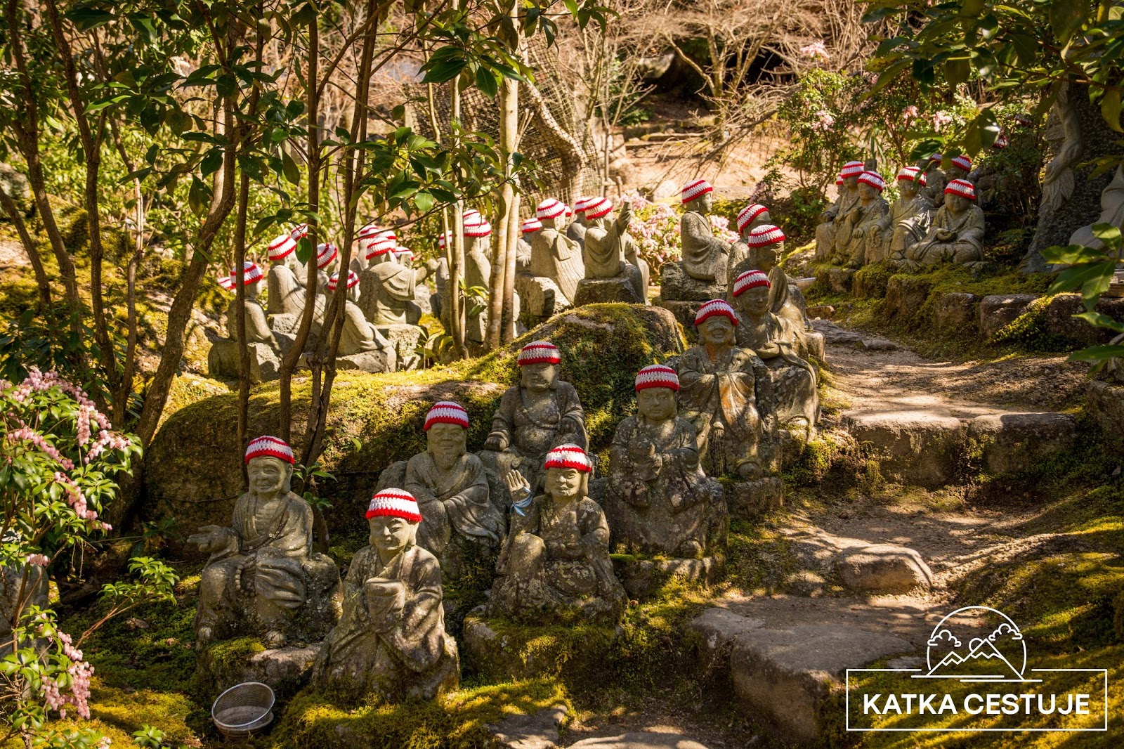 | schodiště lemované pětisty rakan soškami |