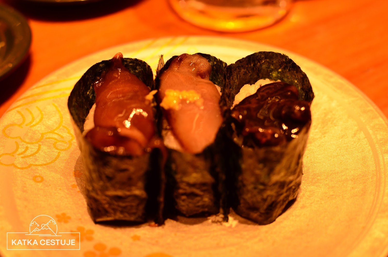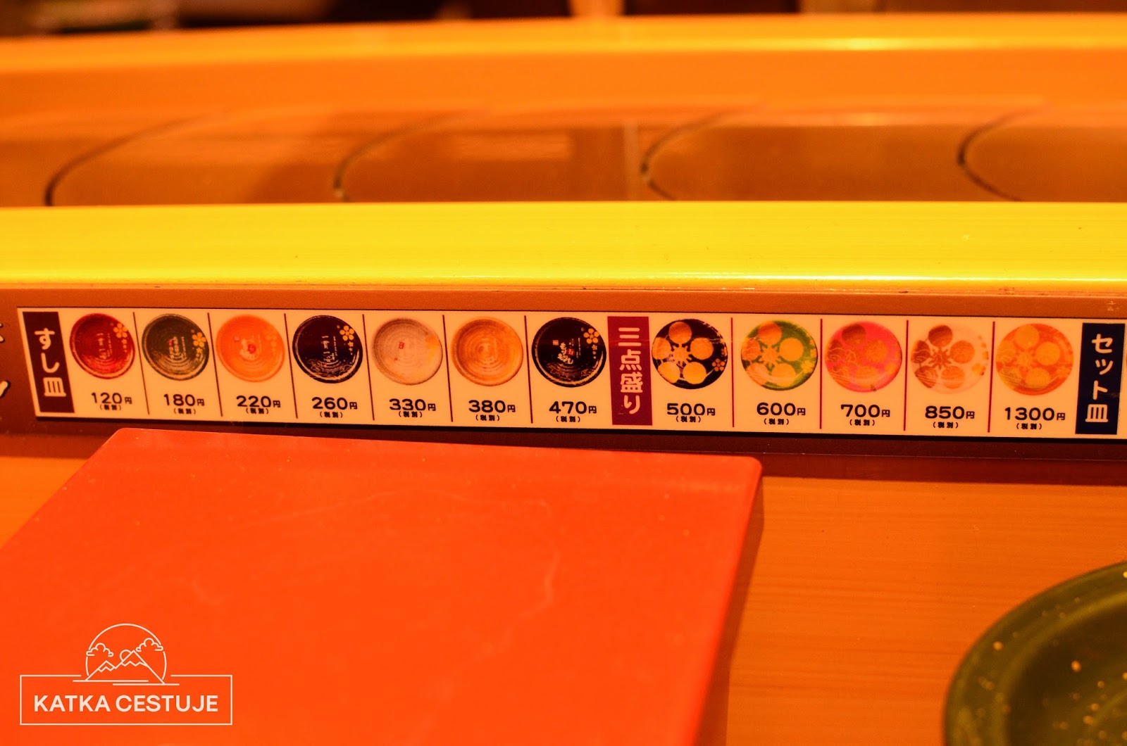 V 19:45 konečně zazní naše číslo a my jsme slavnostně uvedeni na naše místa. Sushi hostina můžou začít! Servírka nám (naštěstí!) přináší anglický návod, jak to tu funguje, takže zbytek večeře probíhá už naprosto hladce a bez nečekaných komplikací. Jakmile jsme usazeni, můžeme si začít brát talířky z dopravního pásu nebo si objednat konkrétní položky na tabletu před námi. Ty nám potom podá buď sushi šéf, který je přímo před námi připravuje nebo nám je donese servírka. Sushi je servírováno na barevných talířcích, kdy každá barva má jinou cenu – tu se dozvíte na názorném ceníku před vámi. Nejlevnější talířek vyjde na 130 jenů (30 Kč), nejdražší potom na 1300 jenů (300 Kč). Na každém talířku jsou vždy dva stejné kousky sushi.