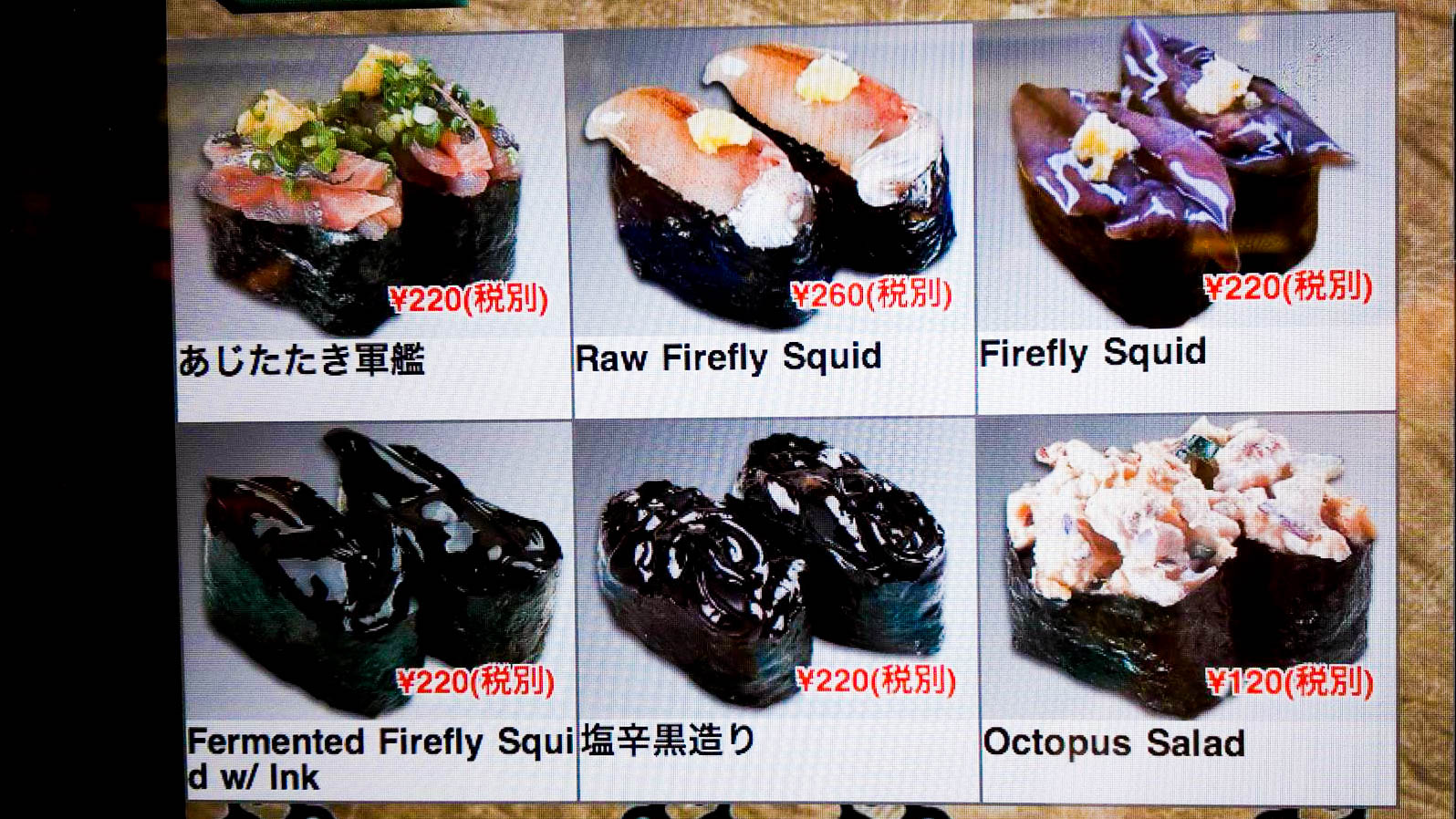 Už při prvním kliknutí na dotykovou obrazovku nám je jasné, že nudit se dneska vážně nebudeme! Nabídka vypadá fakt bláznivě a my absolutně netušíme, jak si z takovýchto šíleností máme vybrat! Všechno to ale vypadá tááák dobře, 90 procent jsme nikdy nejedli a asi 50 procent přesně nevíme, co to je. Až teď, při psaní článku jsem si našla čas přeložit přesné názvy použitých ingrediencí. Vedle klasického tuňáka a lososa tu máme ušeň, návku, hřebenatku, donku rohatou, různé druhy chobotnice, krakatice, jikry, mořského ježka, krevety, garnáta, kraba (konkrétně chionoecetese rohatého). Na bezmasých kouscích si potom hoví jarní cibulka, ibiškovec jedlý, sójové boby či vaječný žloutek. V menu jsou také nejrůznější nápoje, polévky, saláty a deserty. Museli jsme vám to vyfotit, protože, jak se říká – tohle nám doma neuvěří :-).