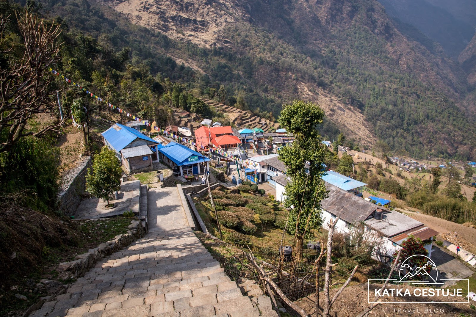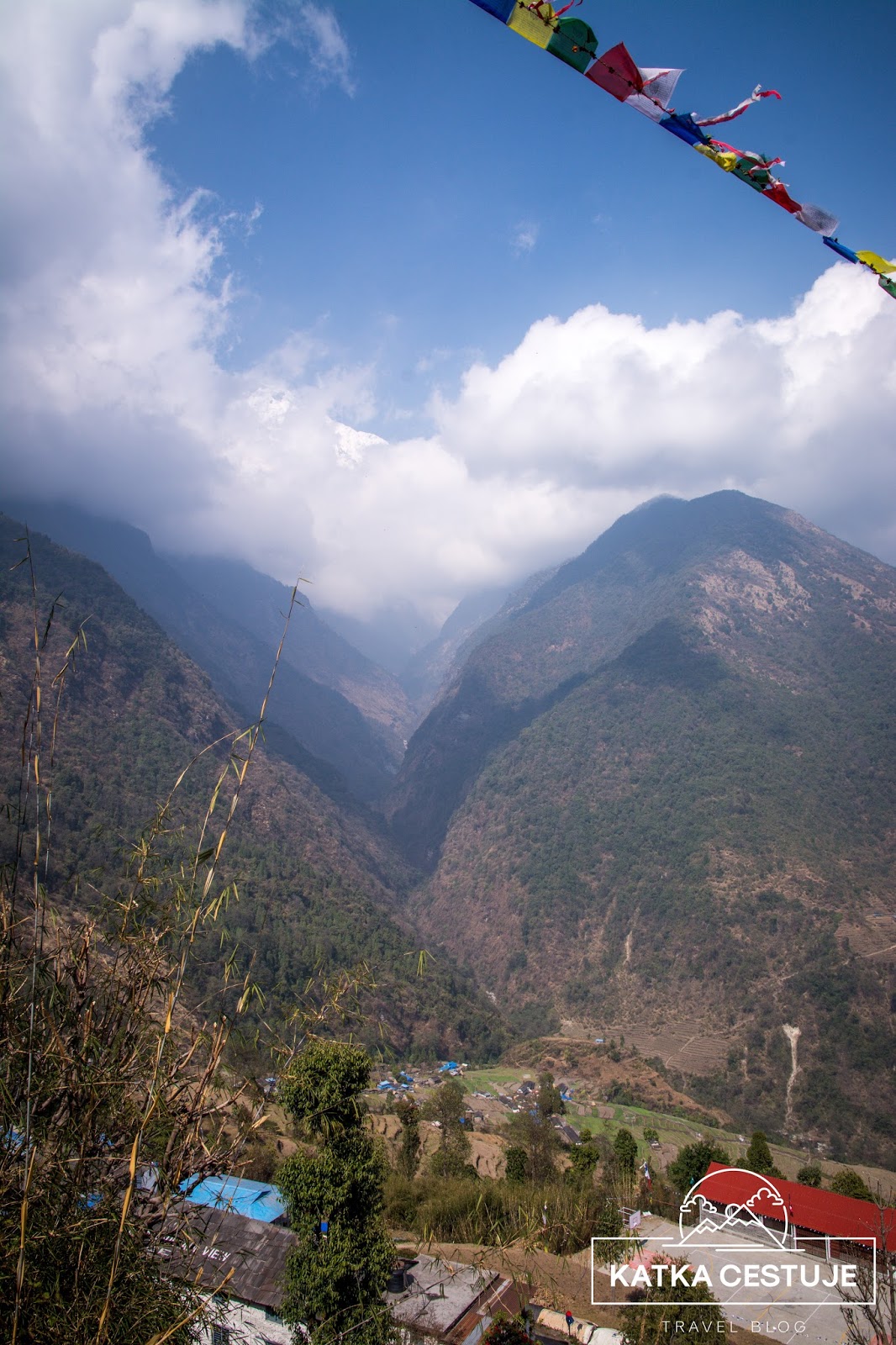 Za další zatáčkou už nás čeká Chhomrong, největší vesnice, kterou na celém treku procházíme. Chhomrong je neskutečně dlouhá a roztáhlá vesnice točící se kolem ostrého kopce v obrovské výšce jako Orlí hnízdo. Nenechte se zmást a nezastavujte u prvních domečků a restaurací. Musíte pokračovat necelé půl hodinky dál okolo kopce, než dojdete do hlavní části, kde se vám otevře úžasný výhled na celé údolí. Tady je nejlepší místo a čas dát si pořádnej voraz a jídlo.