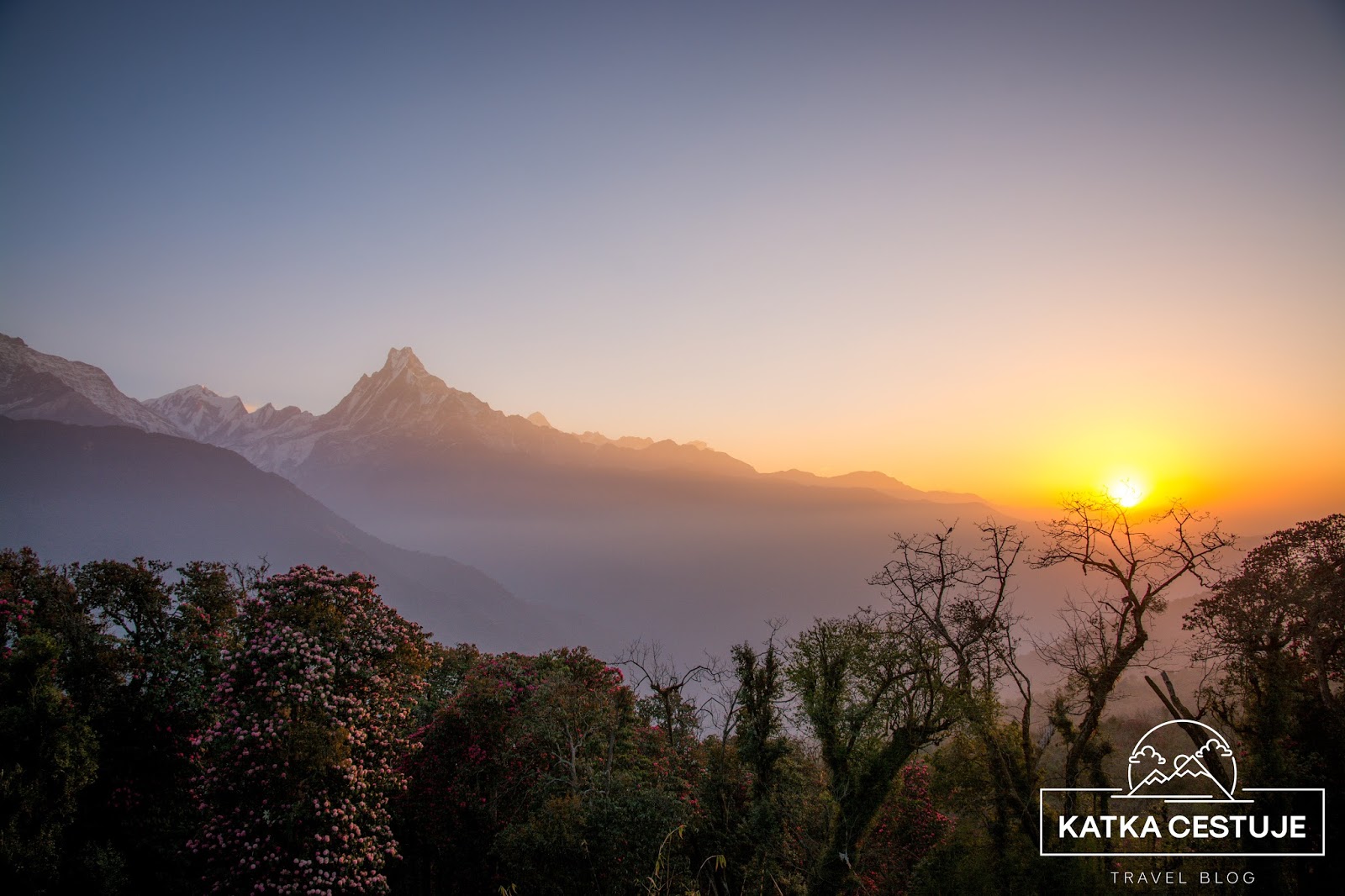 Jednou z nejkrásnějších věcí na horách jsou východy slunce, a ten v Tadapani, ten stál vážně za to. Jak už jsem se zmiňovala v předchozích článcích, hora, která mě v Himaláji nejvíc uhranula nebyla slavná Annapurna, ale Mačapučare (angl. Machapuchare) neboli Fishtail. Tenhle vrchol si mě naprosto získal už na obrázcích, které jsem si prohlížela před cestou do Nepálu. Nejdřív jsem si dokonce myslela, že je to fotomontáž, jak moc se mi tahle hora zdála nerealistická. Její rozeklený vrchol připomínající tvarem rybí ocas (podle čehož dostala také své jméno) působí v krajině opravdu teatrálně.