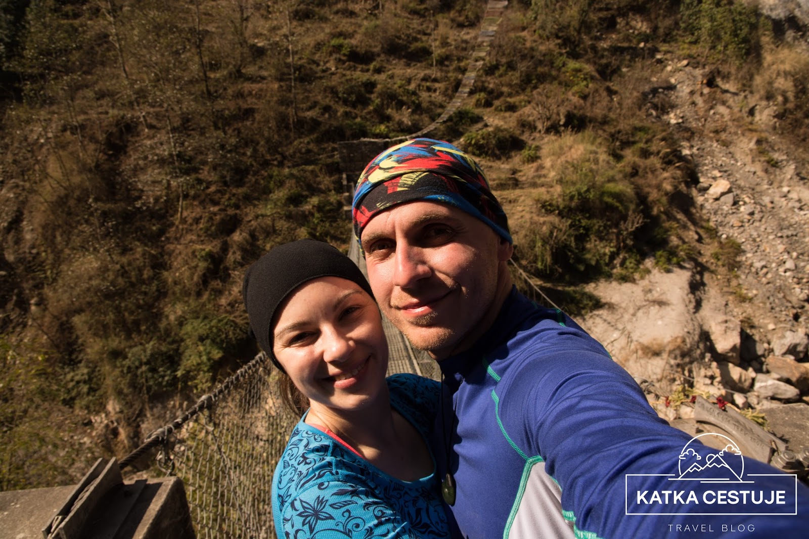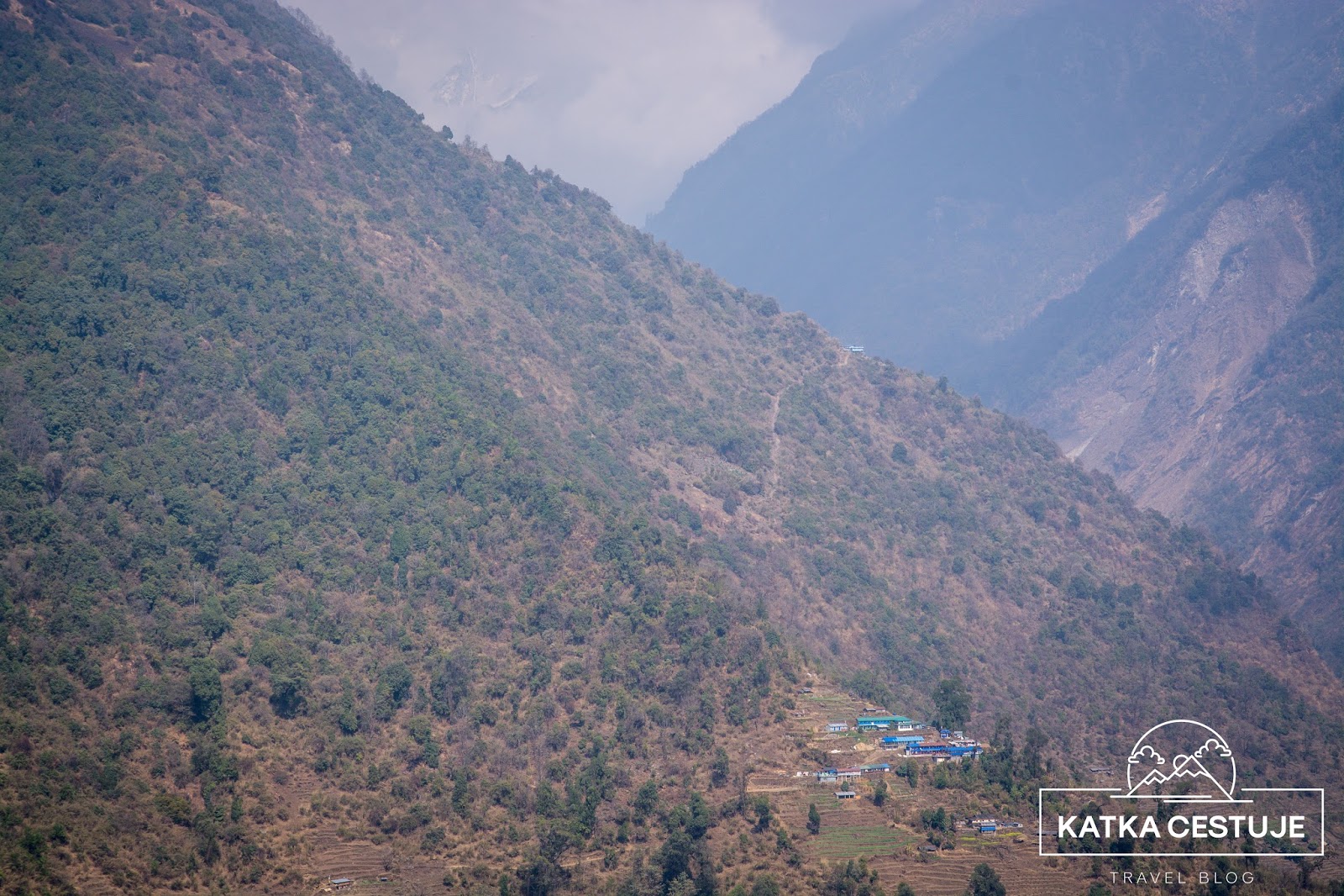 Tady ale prudký sešup nekončí, cesta pokračuje prudce dolů do údolí a my tak můžeme jen nevěřícně koukat na protější ostré svahy, které na druhé straně budeme šlapat zase nahoru. Tohle se ale snažíme už ignorovat, protože to bysme celý den nemohli přemýšlet nad ničím jiným… Holt jsme v Himaláji, a tak chodíme z kopce a do kopce. Snažíme si raději plnými doušky vychutnávat tento parádní výhled ze střechy světa a fascinovaně si prohlížíme okolní krajinu, která se s každým sešlápnutým metrem neustále mění. Nicméně, dolů to jde fakt dobře :-).
