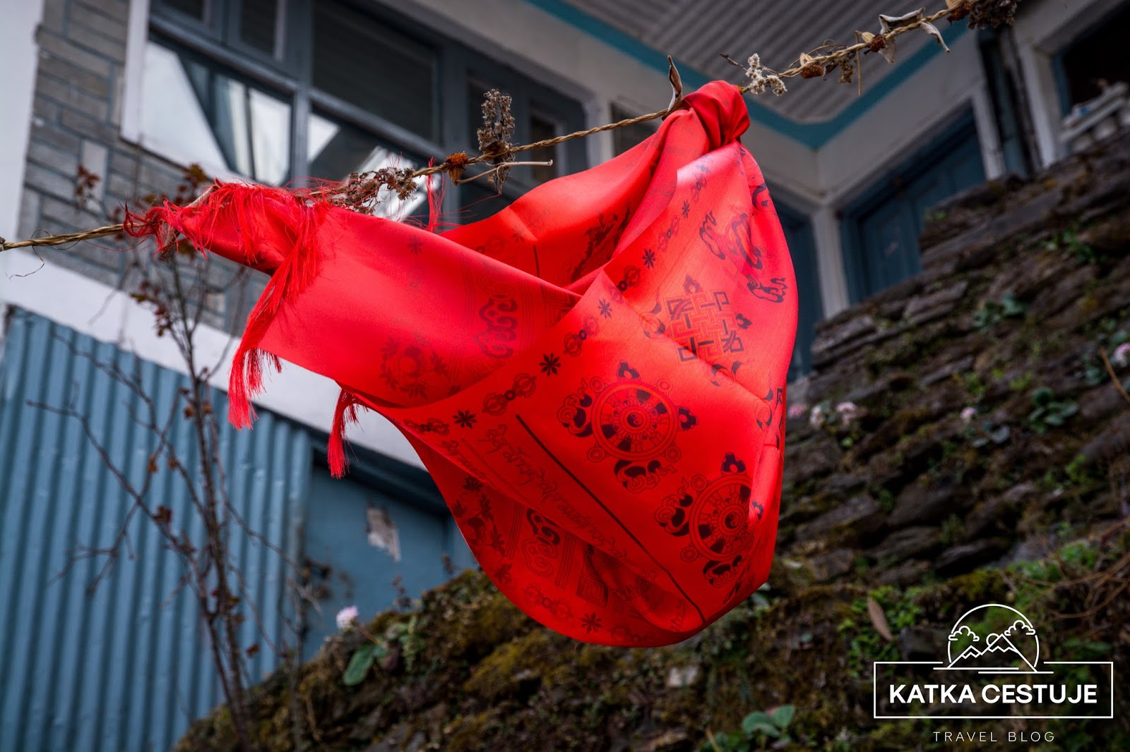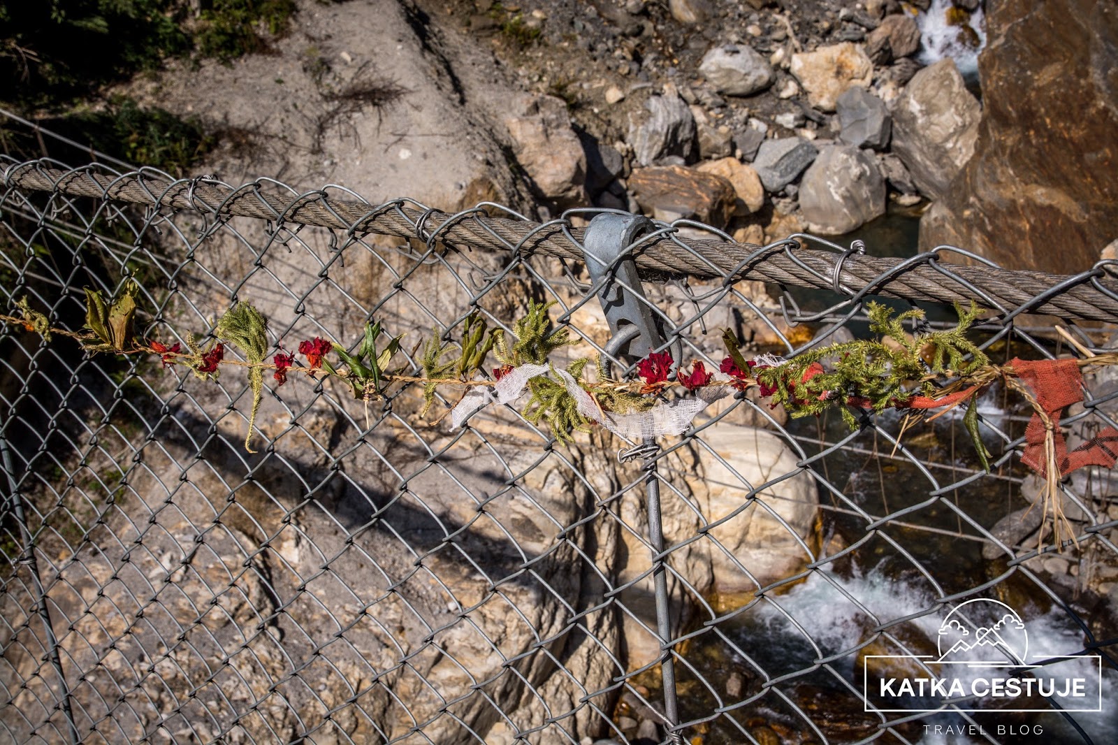Užasle na toho fešáka zírám a úplně cítím studený vítr, který tam z těch ledových polí fouká. Tak tam my jdeme, tam nahoru! Najednou si připadám, jak kdyby mi někdo vstříkl adrenalin do žil a mám opět sílu, sílu jít dál. Naprosto nechápu, kde jsem ji vyštrachala, ale je tam. Navíc zjišťujeme od majitele obchůdku, že teď se jde (pro změnu!) zase hodinu z kopce dolů a to vždycky potěší :-). V těchto místech se naše cesta propojuje z cestou z Landruku, ze kterého přicházejí hikeři absolvující jen výstup do základního kempu Annapurny bez boční trasy k Poon Hillu, kterou jsme šli my. Také tu už oficiálně vcházíme do Annapurna sanctuary, tedy svatyně Annapurny, kde začíná posvátní půda, která má pro věřící obrovský význam. Dokonce takový, že je tu zakázáno konzumovat maso. Oficiální tabule uvádí tohle: