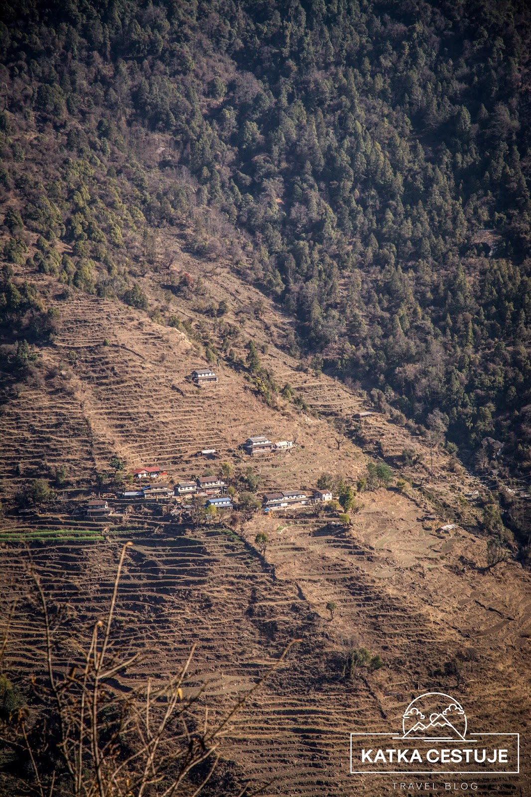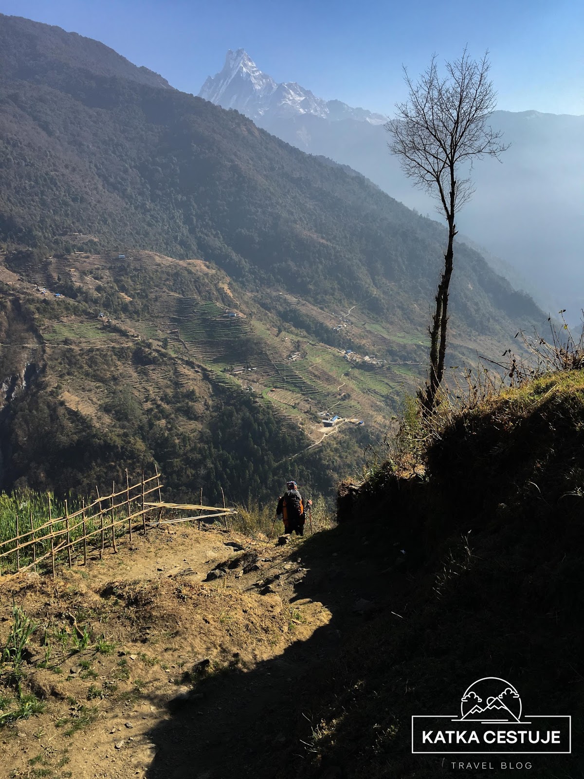 Tohle vás probere mnohem líp než studená sprcha. Prostě magie! Po snídani hned vyrážíme dál, dnes nás čeká spousta dalších sešupů a výšlapů, během kterých se už napojíme na hlavní trasu treku Annapurna Sanctuary vedoucího do základního tábora Annapurny. Dnešek bude vlastně taková spojovací trasa, trošku méně turistická a za mě jedna z nej částí treku (pokud se tak rozlišná krajina dá nějak porovnávat). Většinu cesty procházíme malými vesničkami, lodgí je tu jen minimum a my tak krásně vidíme, jak tu lidé doopravdy žijí. Hned na začátku pořádně klesáme do vesničky Chuile, kde na nás okamžitě mocně dýchne pravá rurální atmosféra horského života Gurungů.