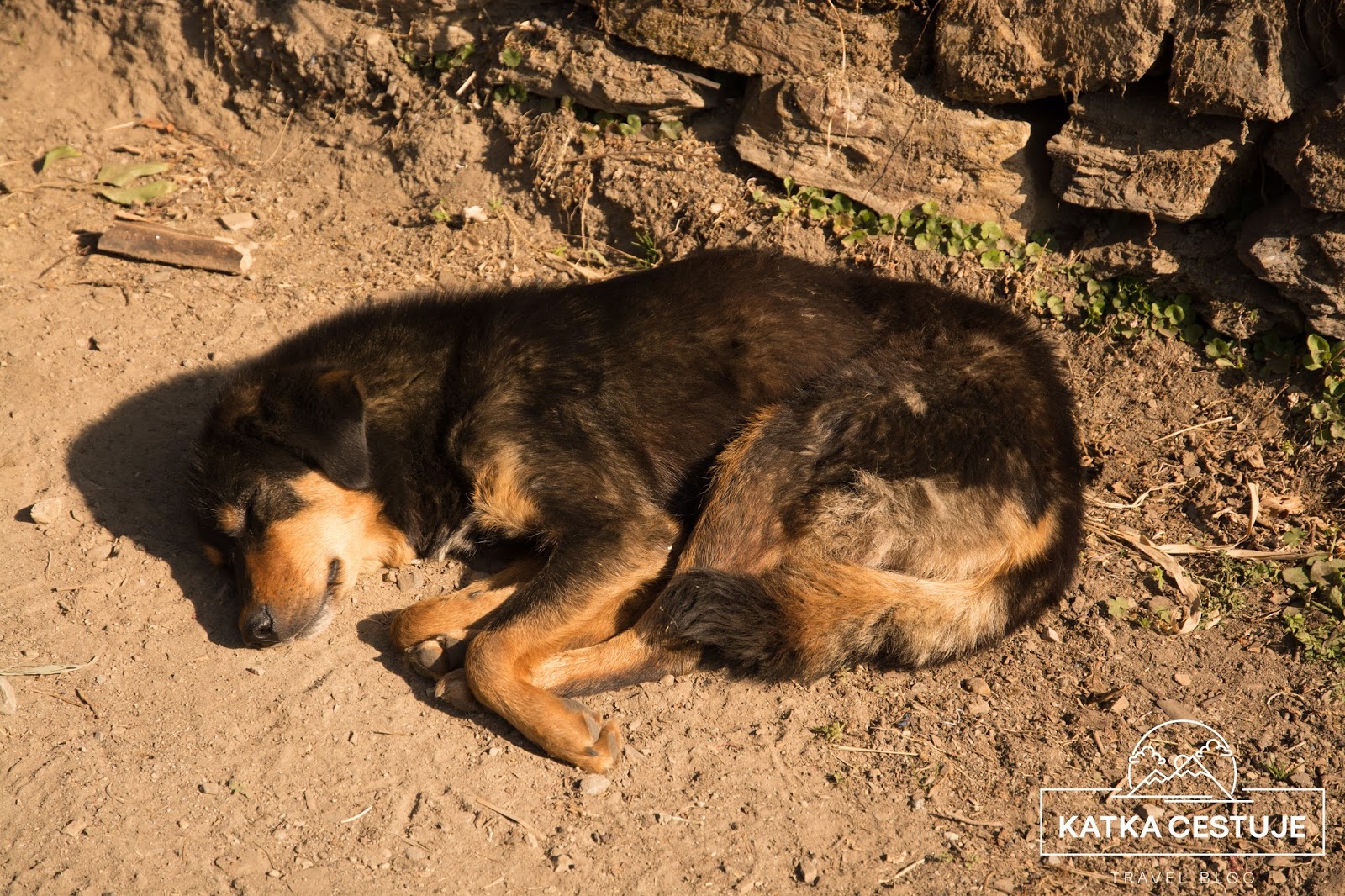 Cestou potkáváme nosiče, který s obrovským nákladem na zádech hopskají po kamenných schodech jako kamzíci a naložené oslíky, kteří už tak nadšeně nehopskají. Dva jsou dokonce tak vyřízení, že jsou úplně durch mokří, teče z nich pot, třepou se a nemají ani sílu nám uhnout z cesty. Je mi jich fakt líto…